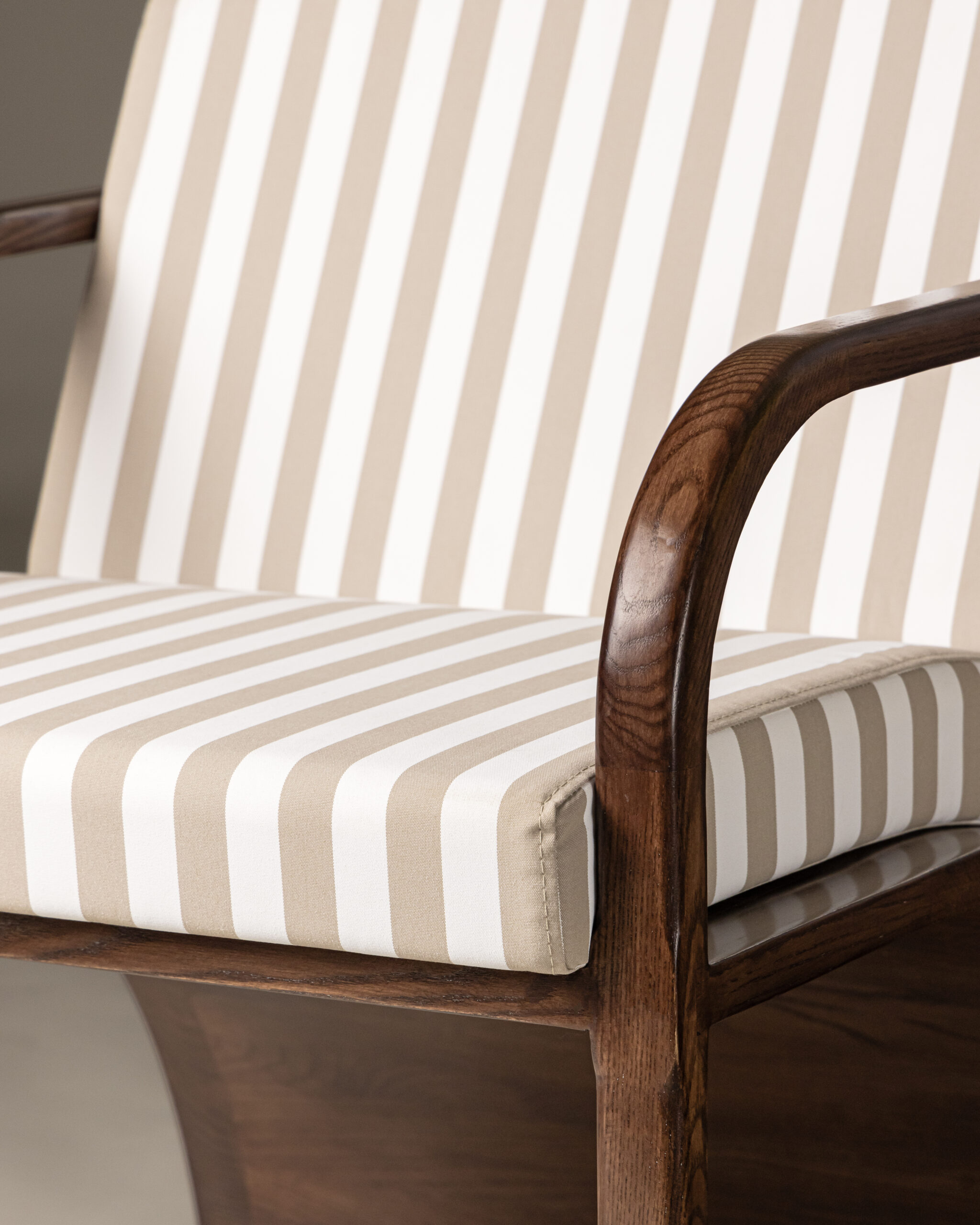 The defining feature, a continuous wooden arc, sweeps gracefully from the back leg through the seat, forming a seamless gesture that unites every element of the chair. This uninterrupted line not only strengthens the structure but also evokes a sense of quiet rhythm — as though the chair itself were drawn in a single, confident stroke.