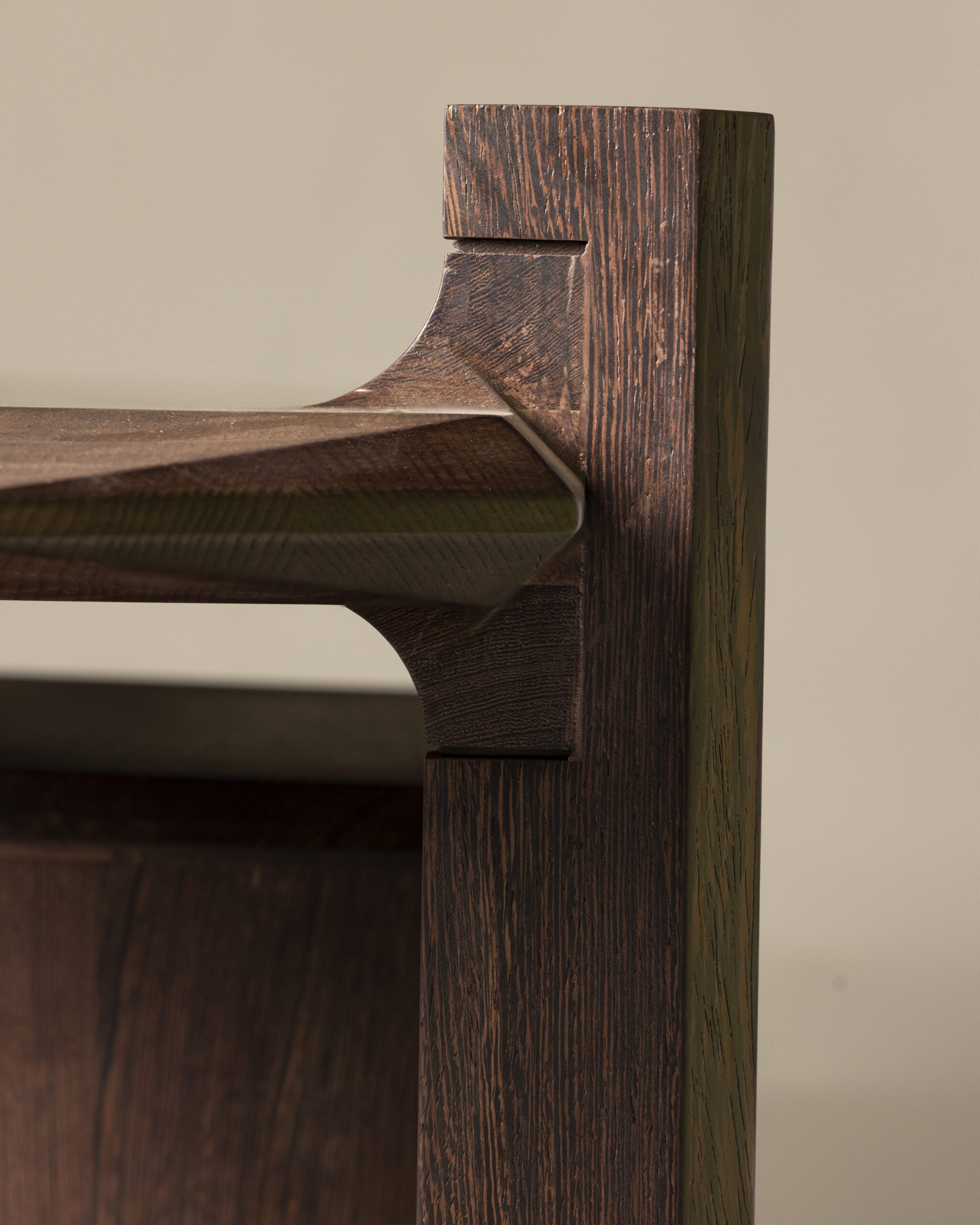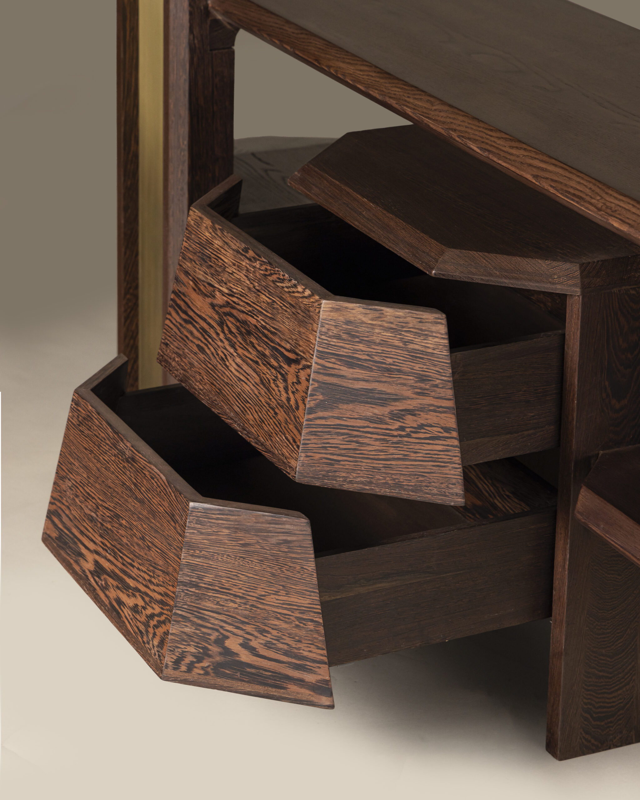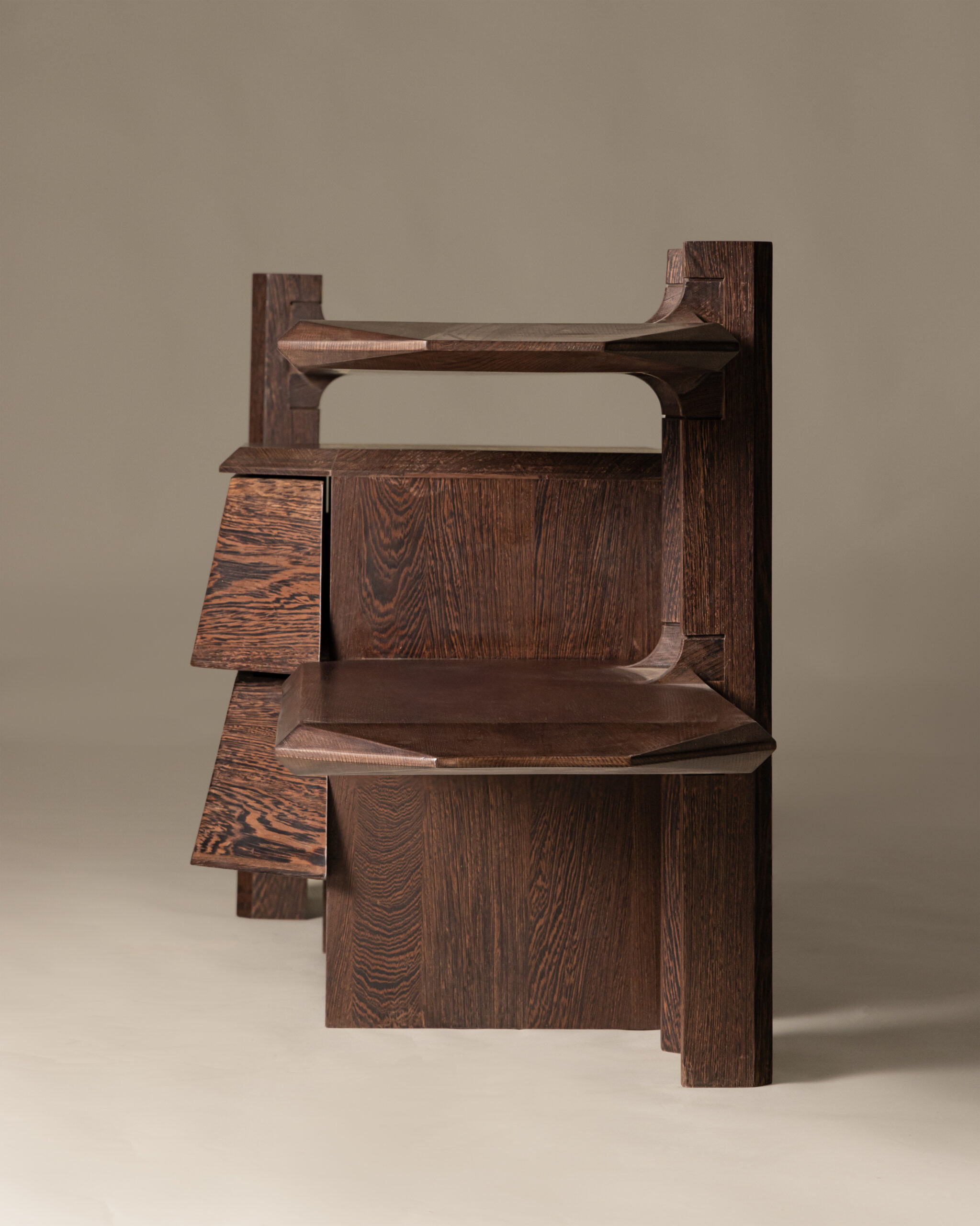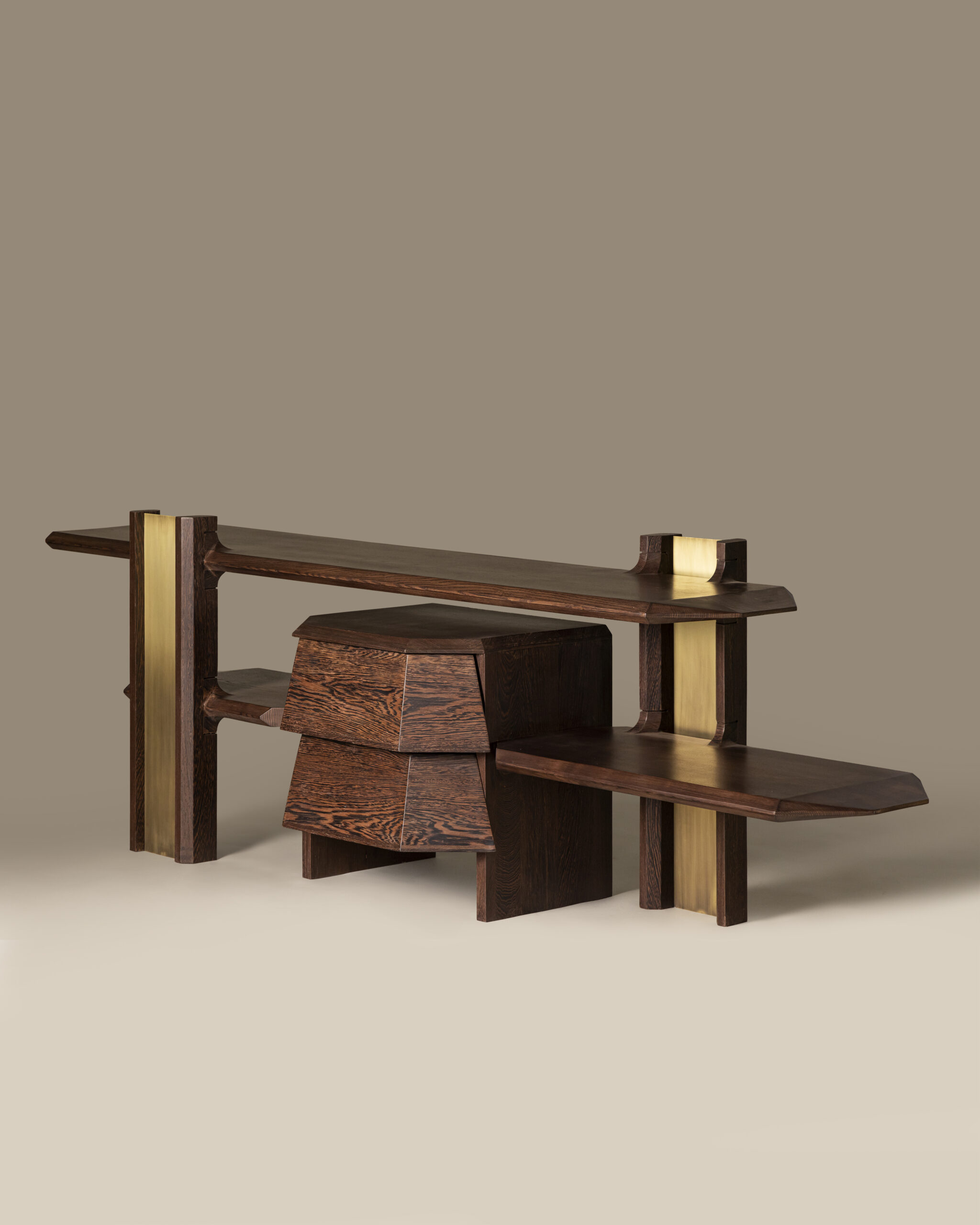 Two seamless drawers and dual open slabs provide a thoughtful balance between concealed storage and display, maintaining a clean, organized aesthetic while preserving visual rhythm. The contrast of dark and light wood tones accentuates depth, creating a dialogue between shadow and texture that changes subtly throughout the day.