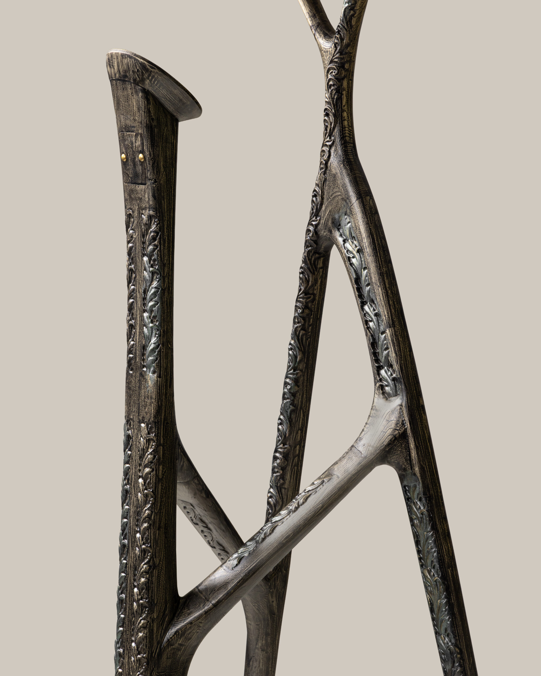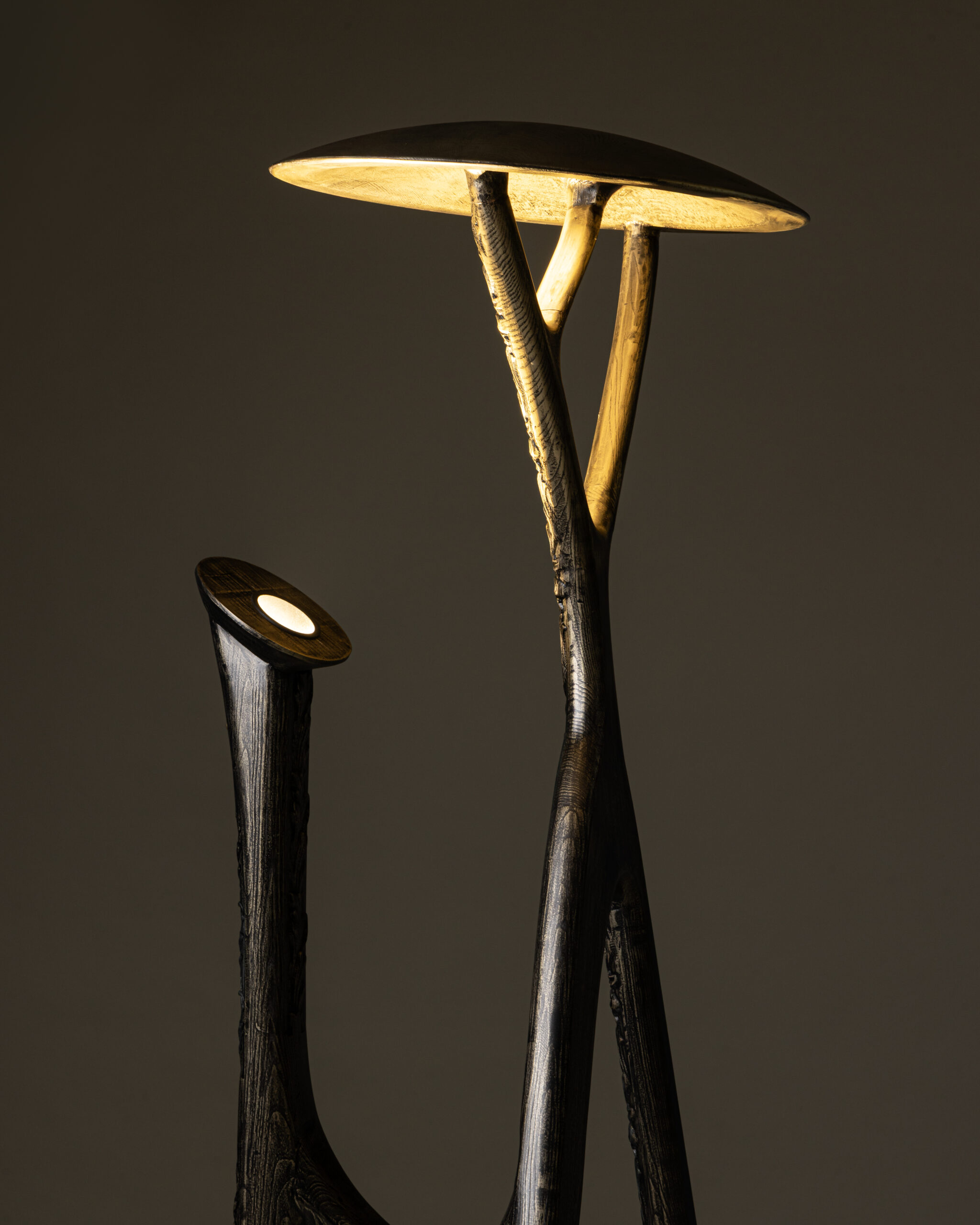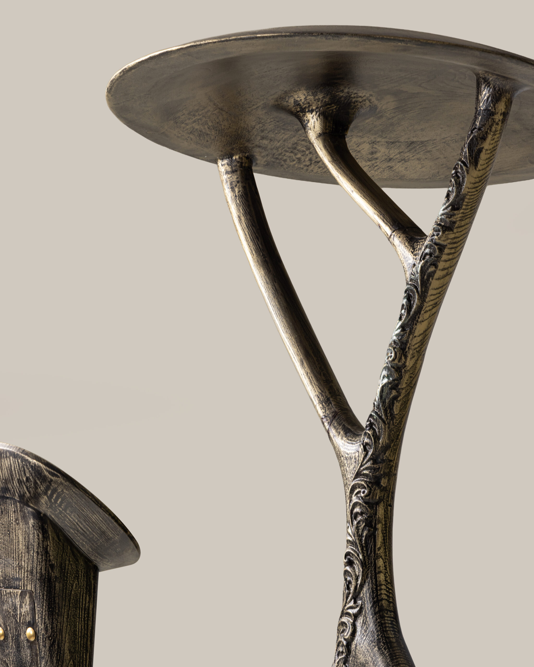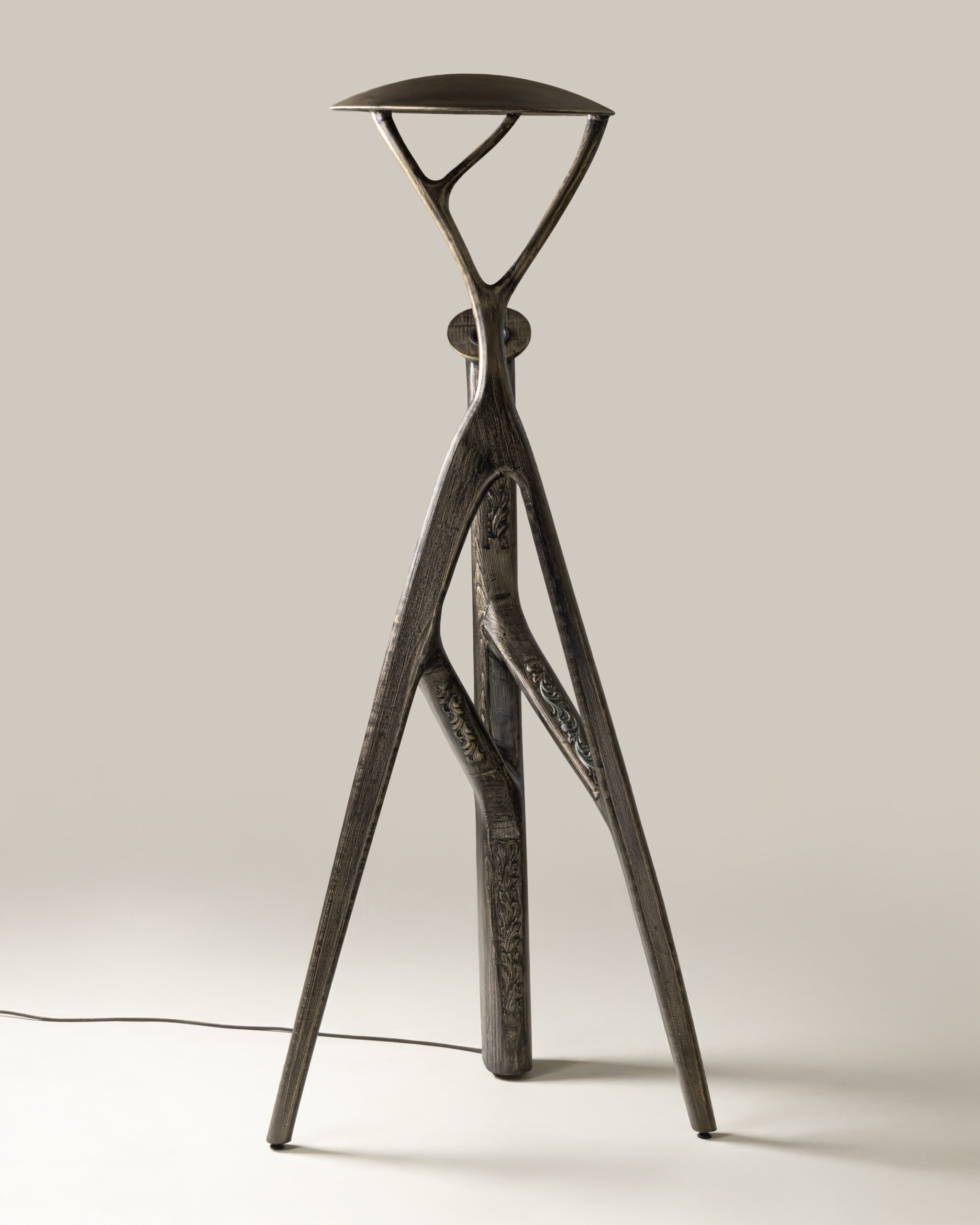 Handcrafted in metal and wood, the Relic embodies a rare alchemy: organic lines fused with brutal elegance. It is tall, enigmatic, and impossibly poised — a piece that captivates not by ornament, but by presence. When illuminated, it casts long, dramatic shadows, turning the surrounding space into a scene of quiet theatre. In darkness, it becomes a silhouette of pure symbolism — a guardian, a monument, a relic of power.