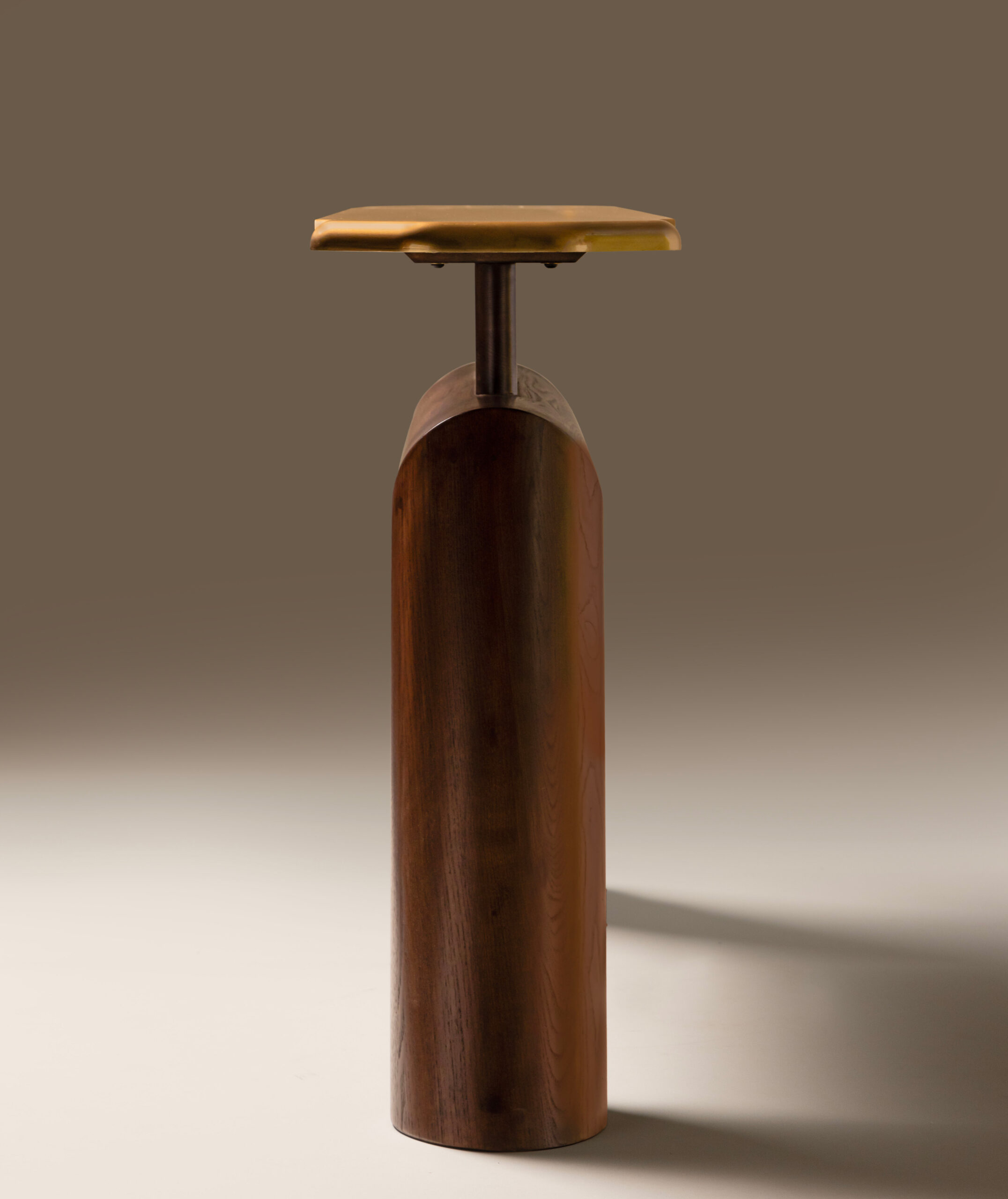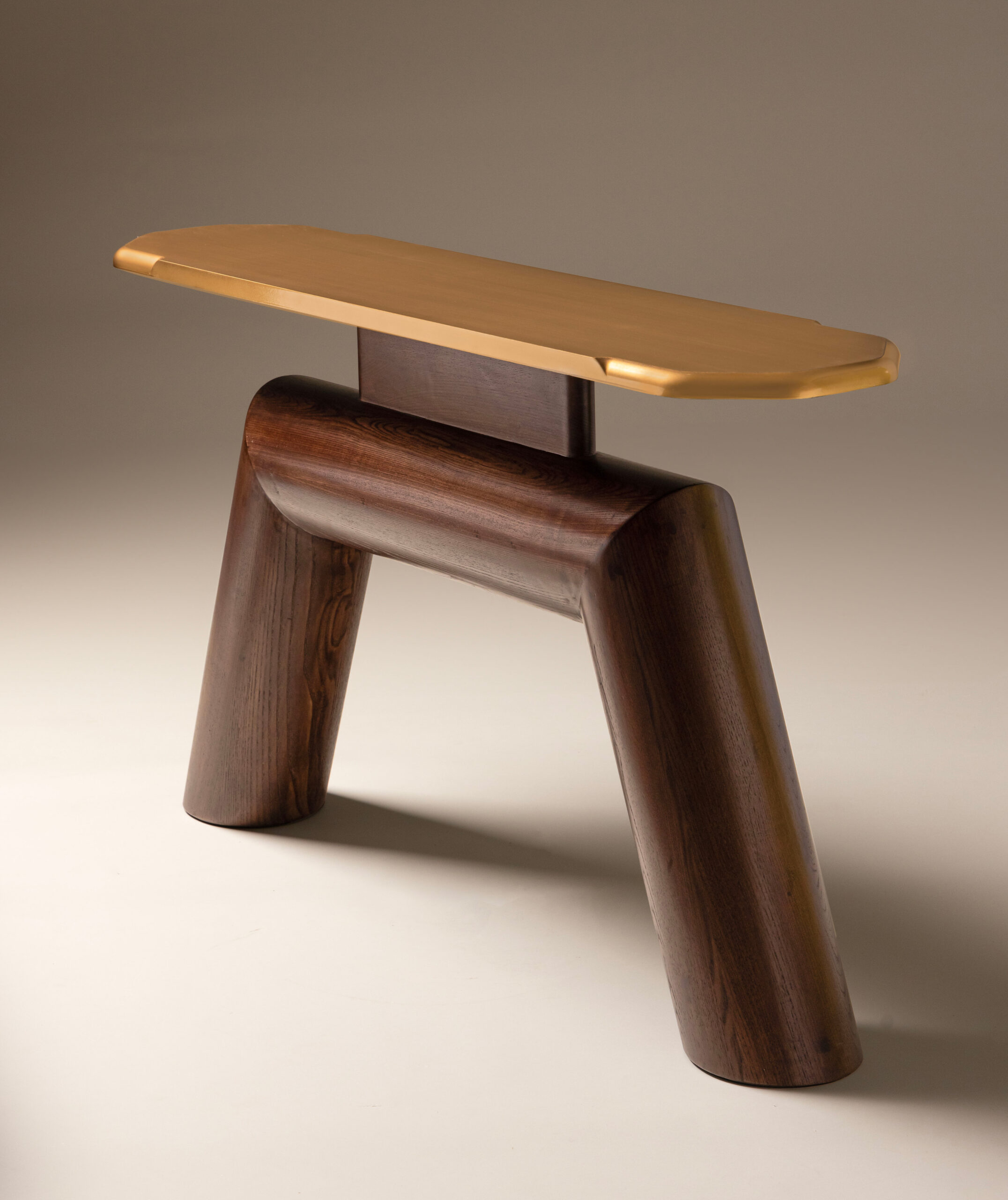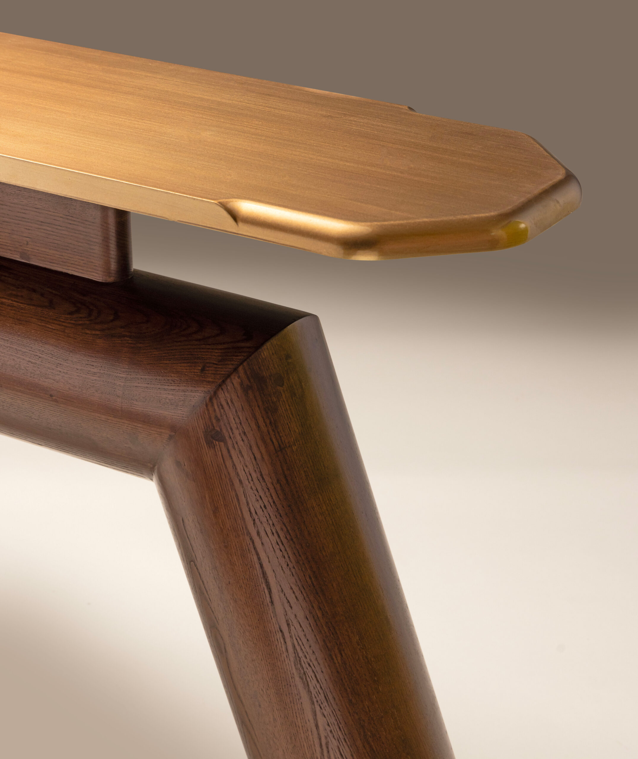 Its sculpted wooden legs echo the anatomy of equine motion — muscular yet fluid, grounded yet light. The craftsmanship reveals a mastery of proportion and poise, each leg carved to suggest motion frozen in time. Resting above, the sleek brass top glides visually across the form, like a saddle shaped by precision and purpose. The contrast of warm wood and cool metal creates a dialogue of textures — raw and refined, tactile and reflective.