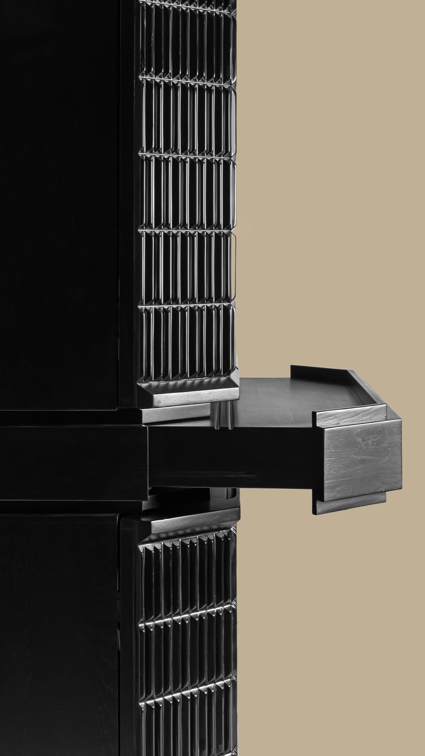 The name Escala, meaning scale or rise, reflects its architectural nature — an ascension of rhythm and precision that unfolds vertically and horizontally in harmony. Crafted by Home of Chirmi, the cabinet’s bold black façade commands attention while maintaining a quiet dignity. Its textured planes catch and release light through the day, revealing depth, craftsmanship, and intention.