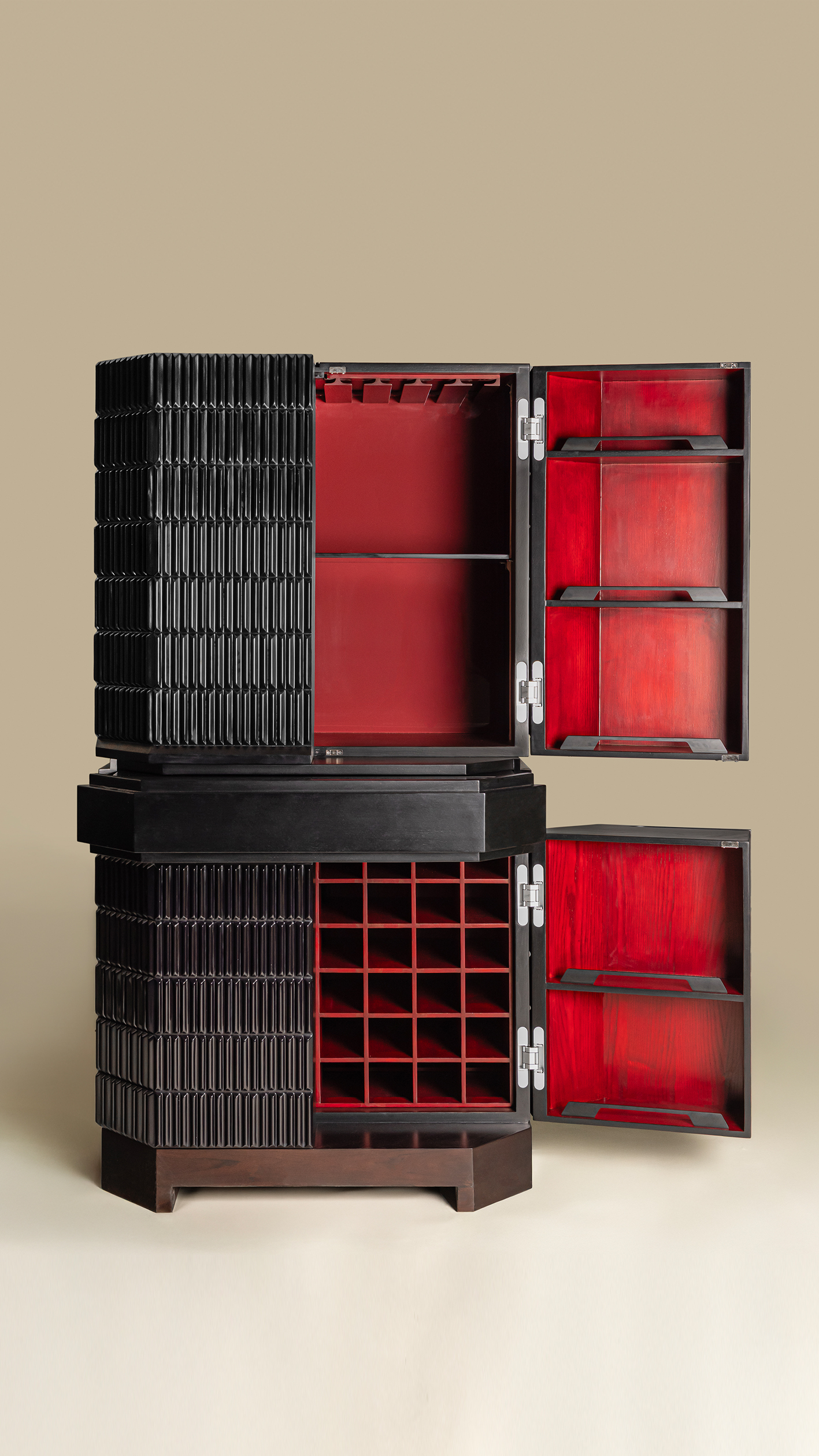 The Escala Bar Cabinet by Home of Chirmi is a study in rhythm and elevation — where every groove, panel, and hue rises in deliberate harmony. Its bold black façade, paired with a striking crimson interior, creates a theatrical reveal that mirrors Chirmi’s philosophy: timeless craftsmanship meeting contemporary drama. Much like a crescendo in a symphony, Escala transforms hosting into a performance — elegant, structured, and unforgettable. A celebration of design discipline and dramatic emotion, the Escala Bar Cabinet stands as an expression of duality — restraint and reveal, stillness and crescendo. Designed as both furniture and performance, it captures the poetry of movement within structure, where every groove, proportion, and surface is orchestrated like notes in a perfectly measured composition.
