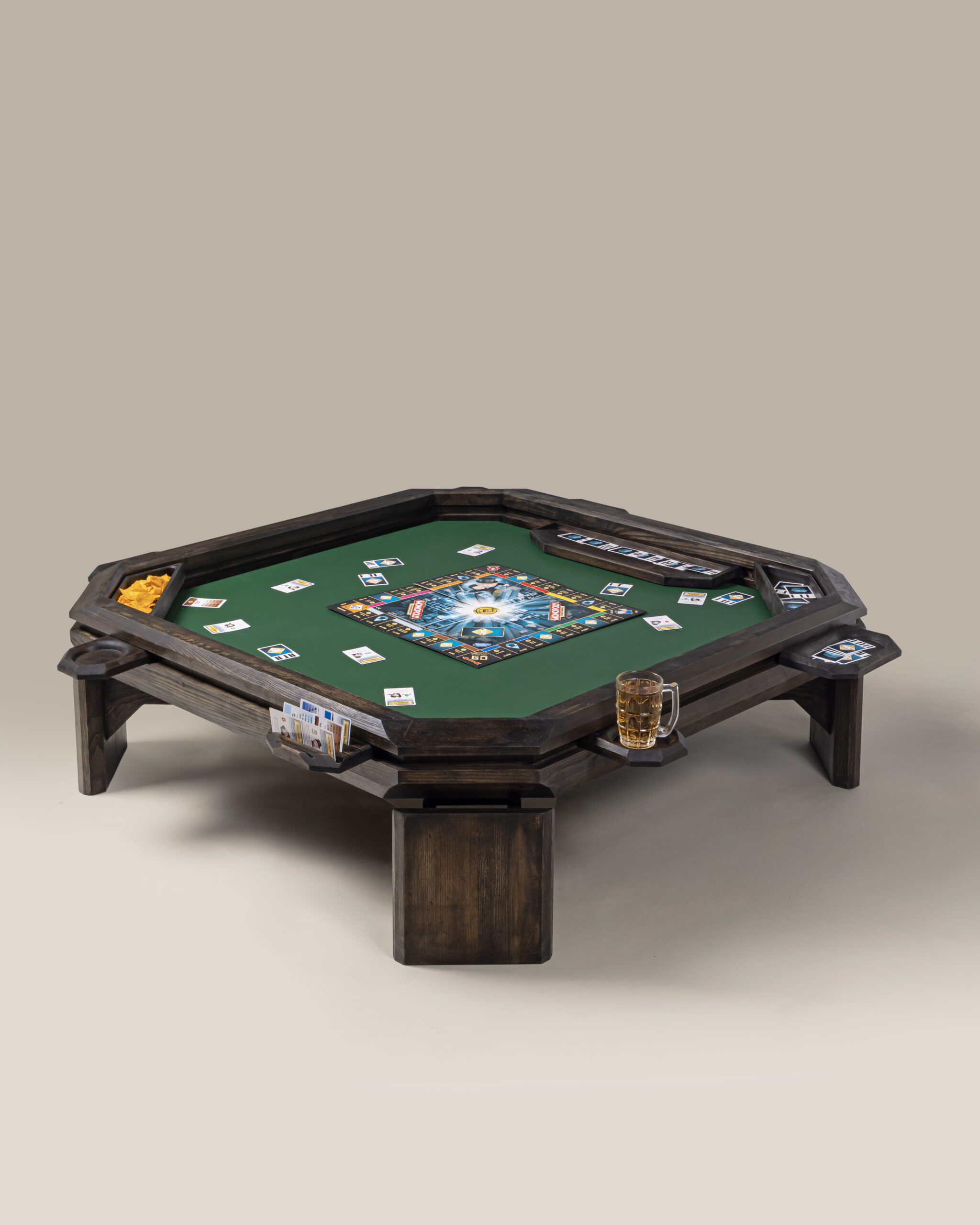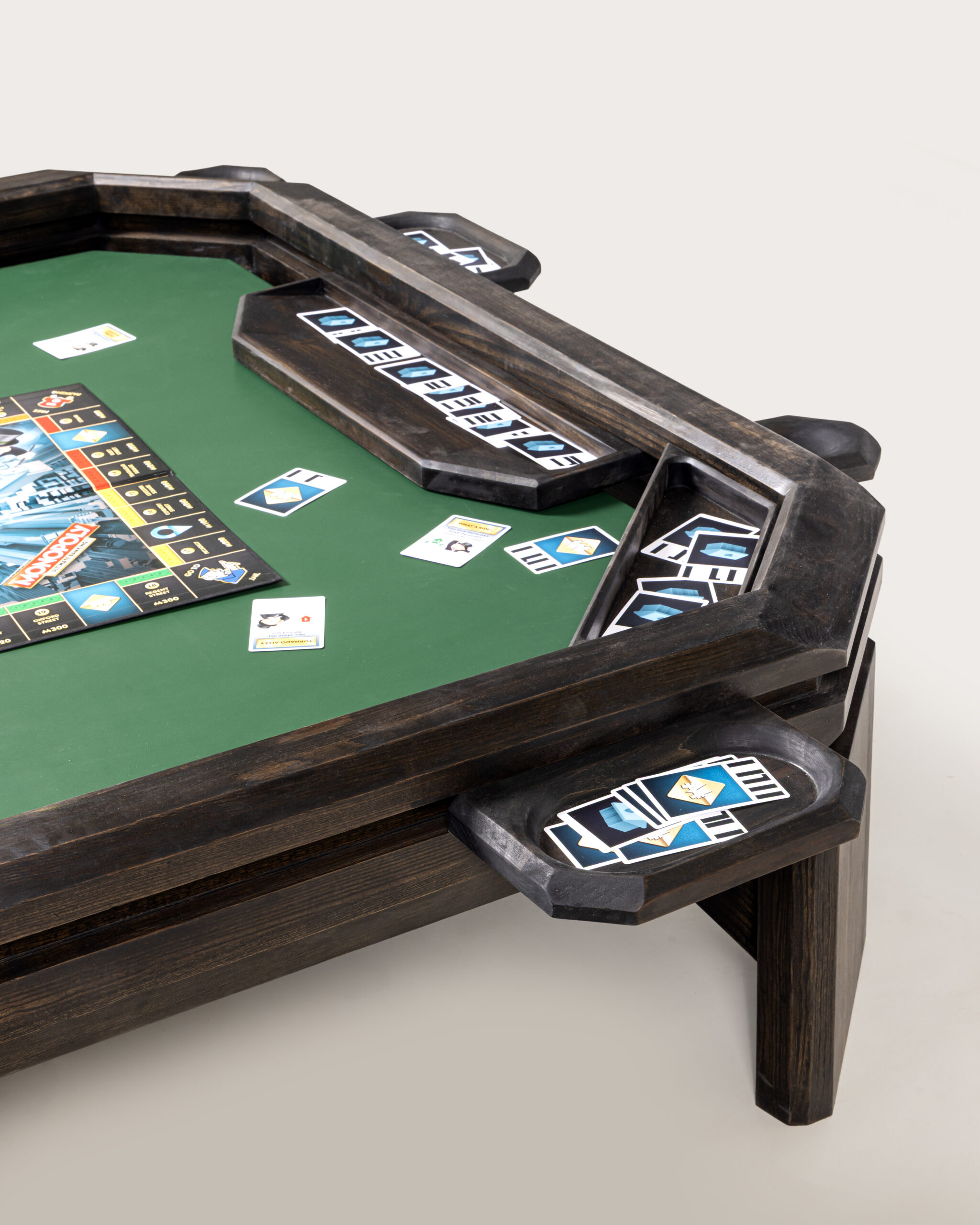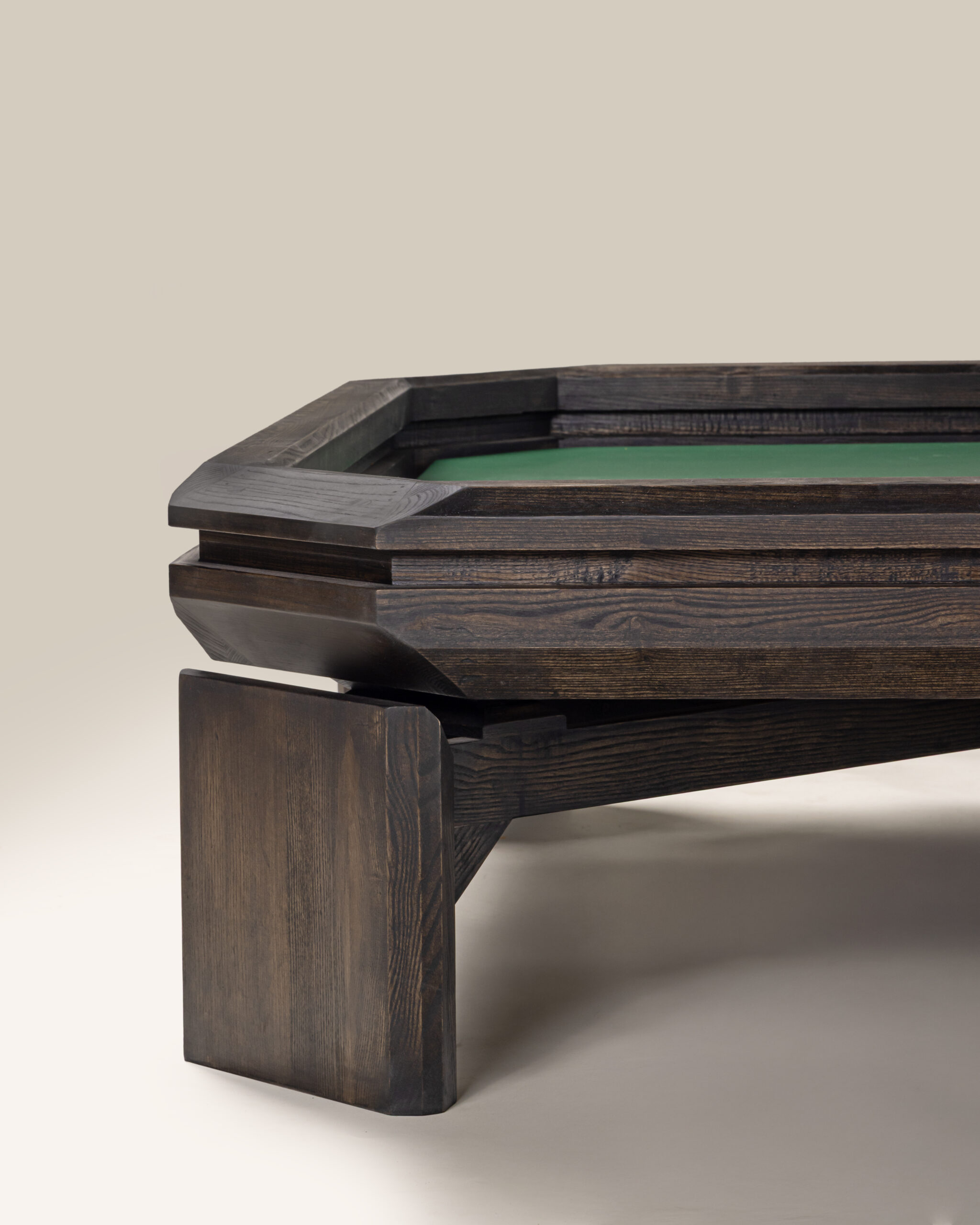 The table’s geometry evokes control and motion, its sleek silhouette grounding the chaos of play in an atmosphere of composure. From afar, it appears monolithic and calm; up close, it reveals intricate layers of material, texture, and craftsmanship — a metaphor for the duality of play itself: lighthearted yet deeply strategic.