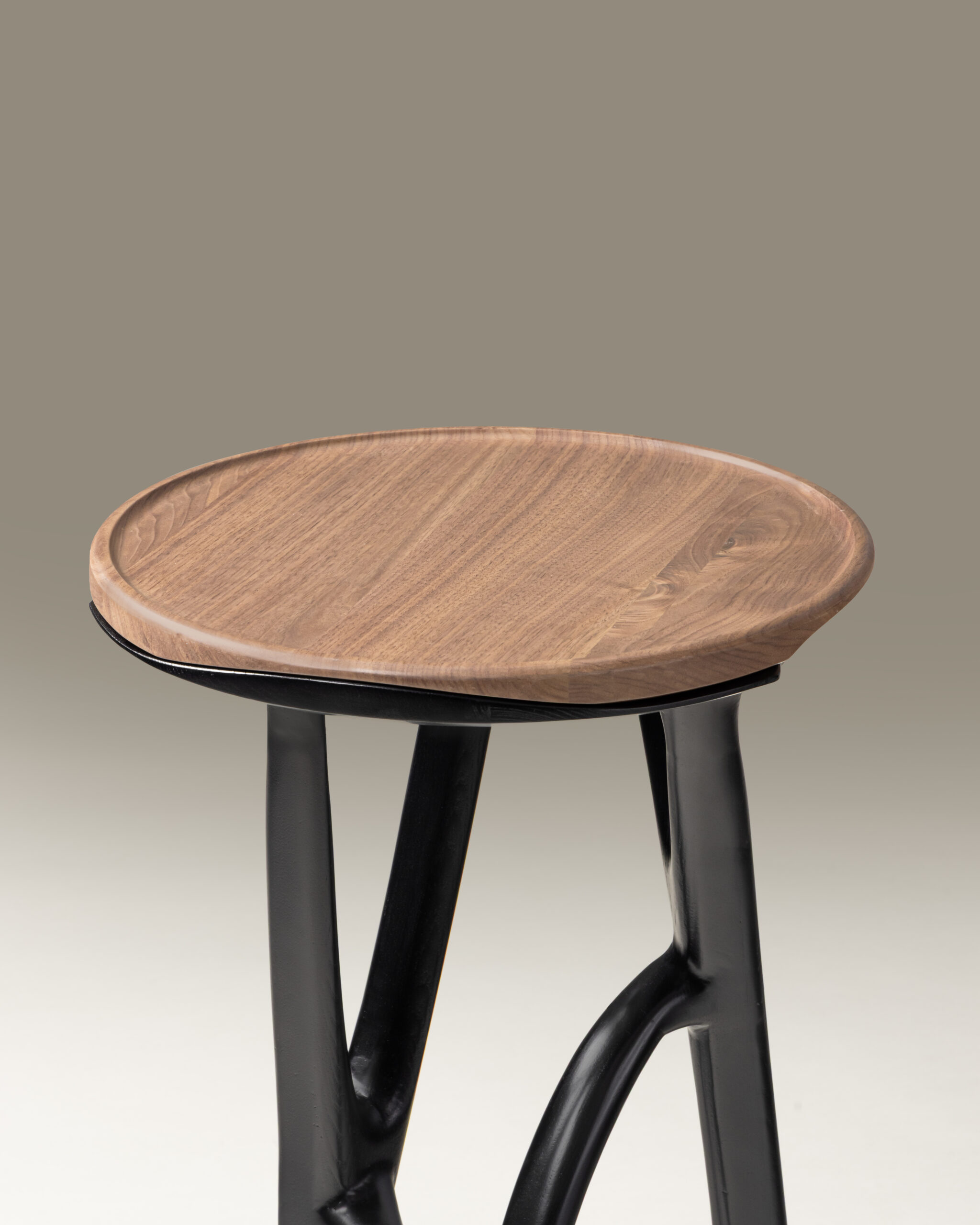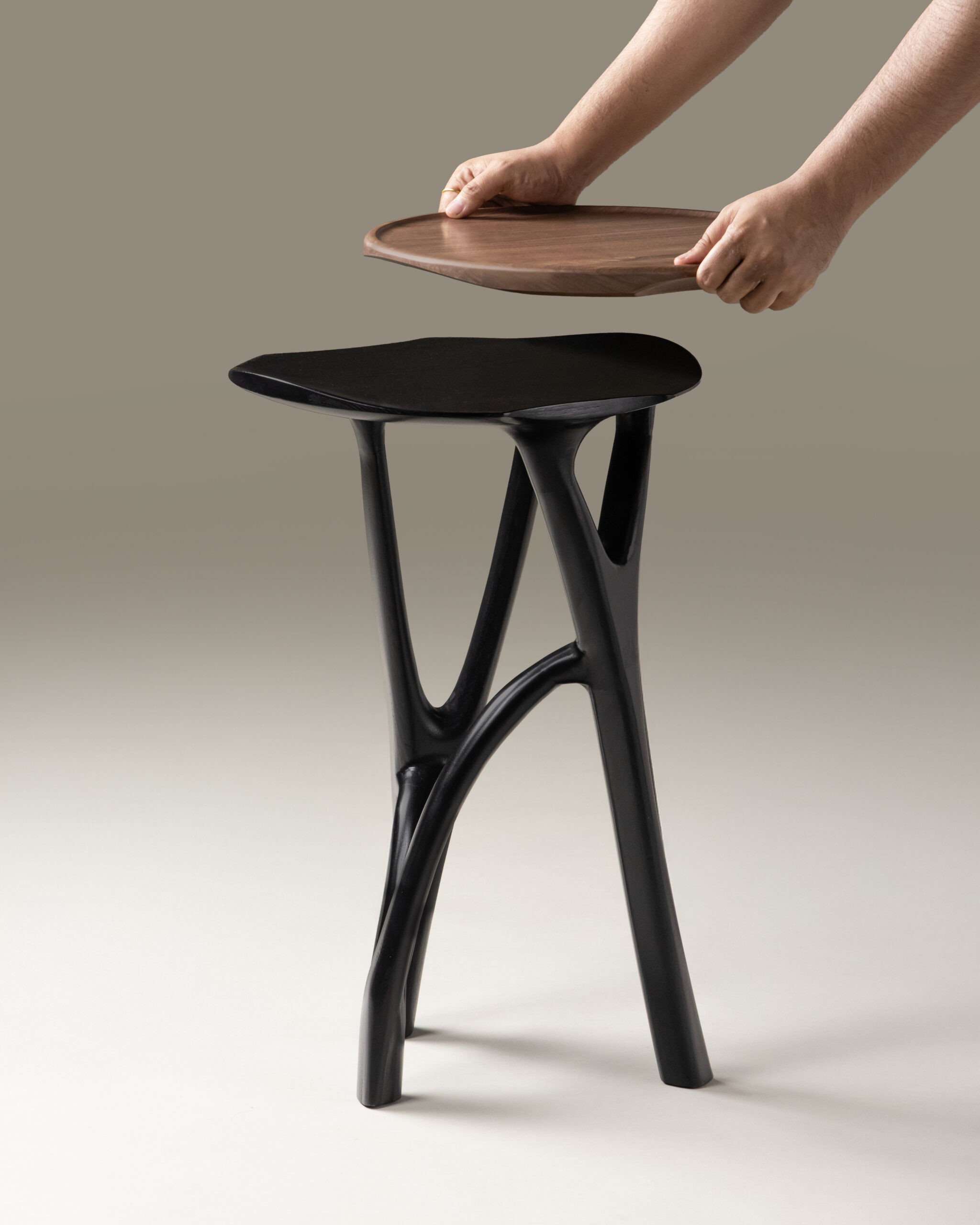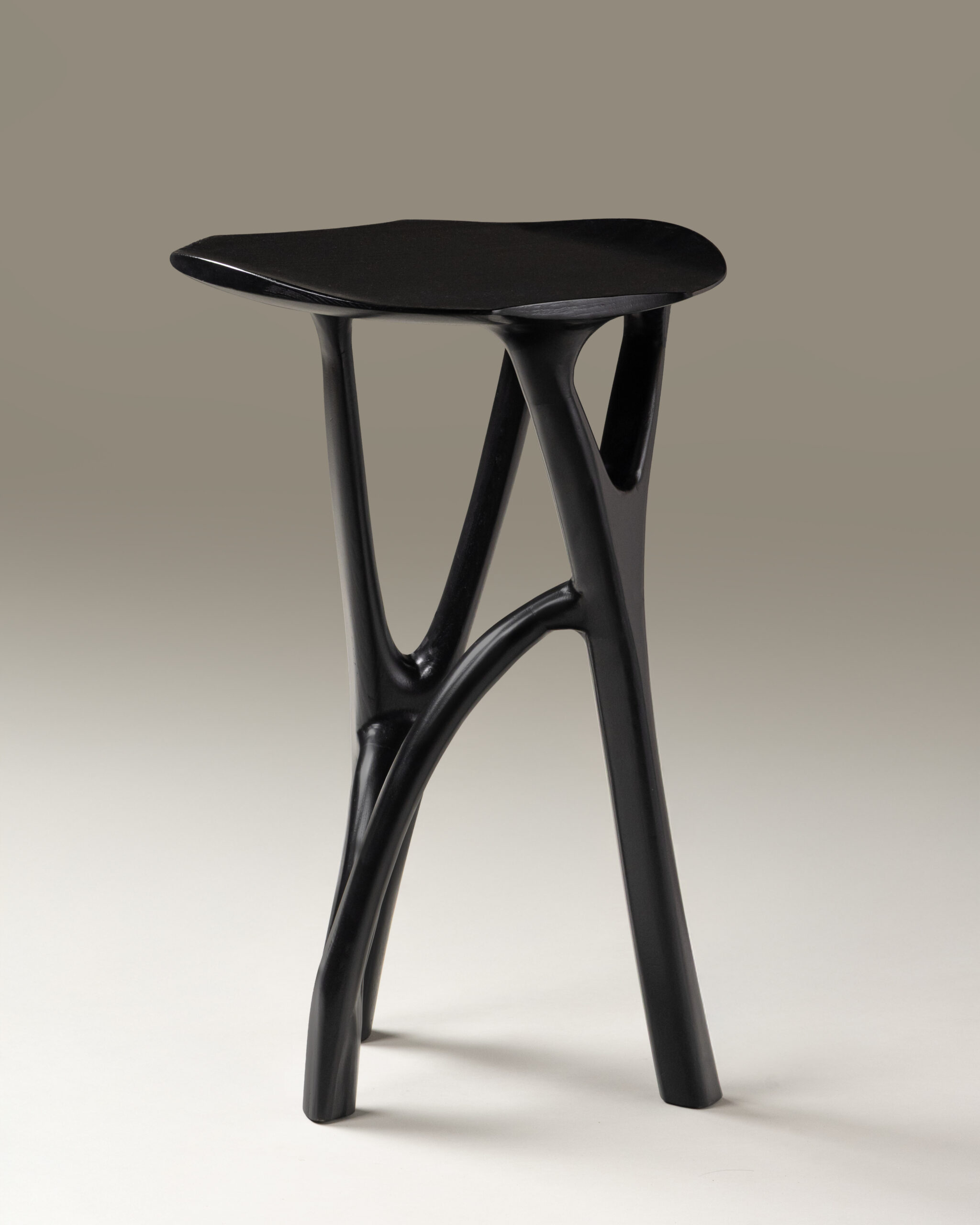 Sculpted in a deep, matte black finish, the base carries the primal energy of something both organic and engineered — a fusion of biomechanical grace and modern minimalism. The table’s stance feels alive: three legs interlaced in a delicate tension, supporting the top with a confidence that feels almost instinctive. It is as much a gesture as it is a piece of furniture — a study of balance, asymmetry, and refined abstraction.