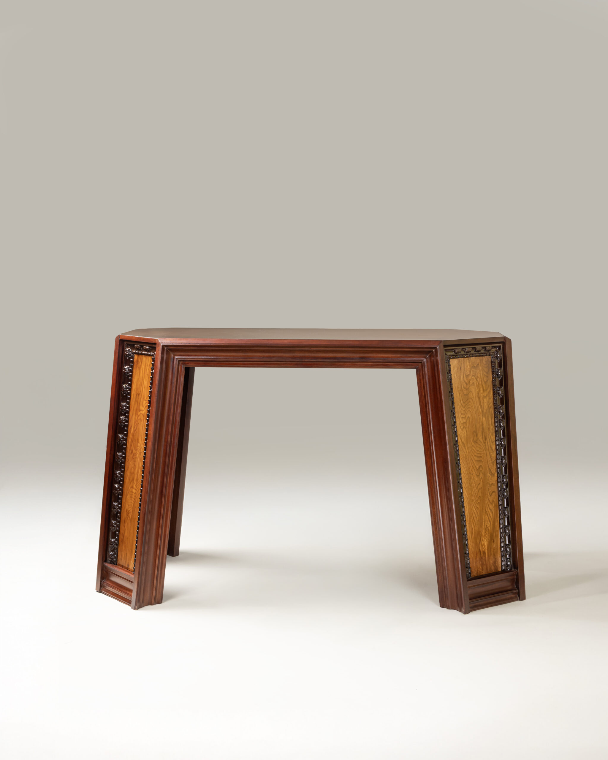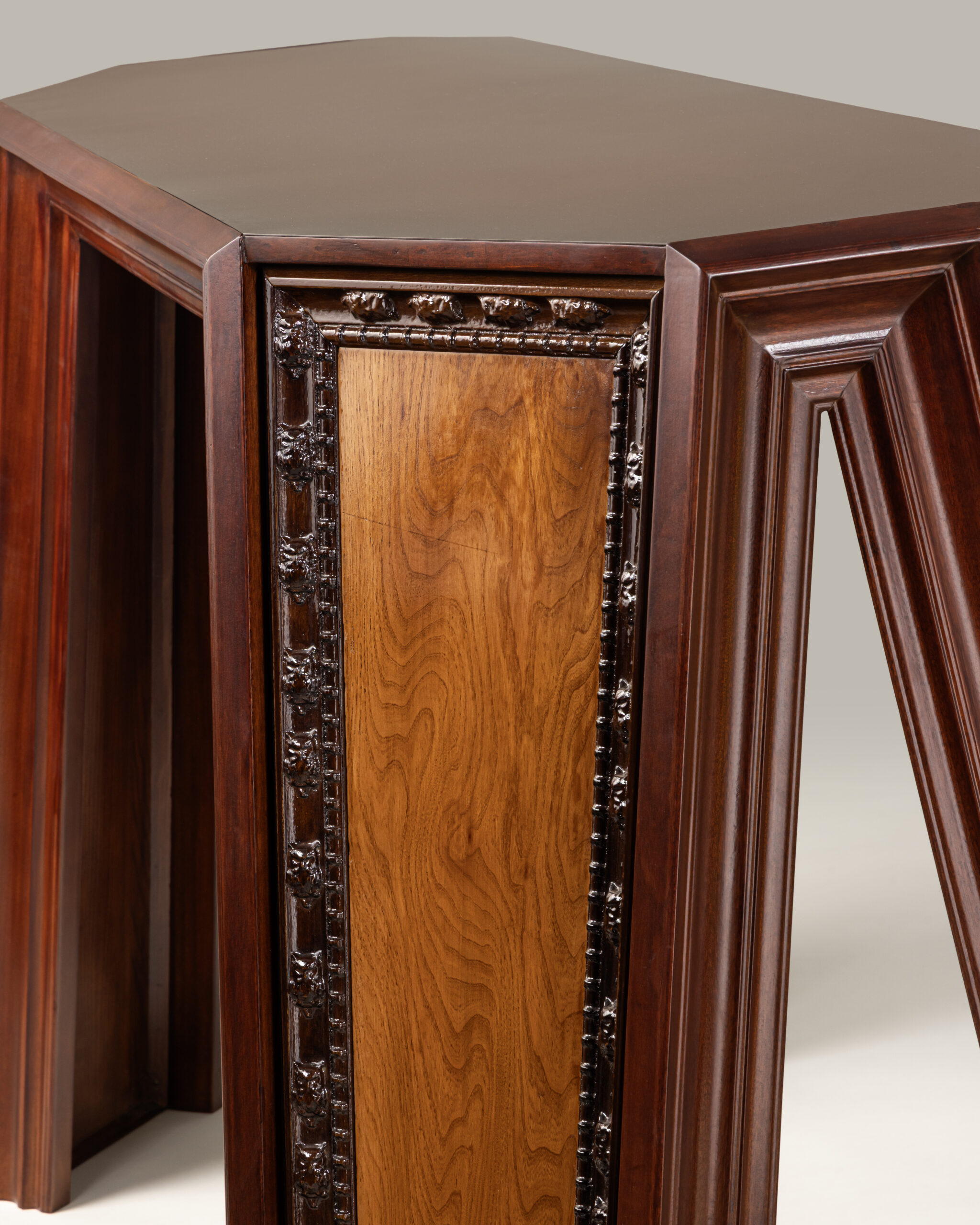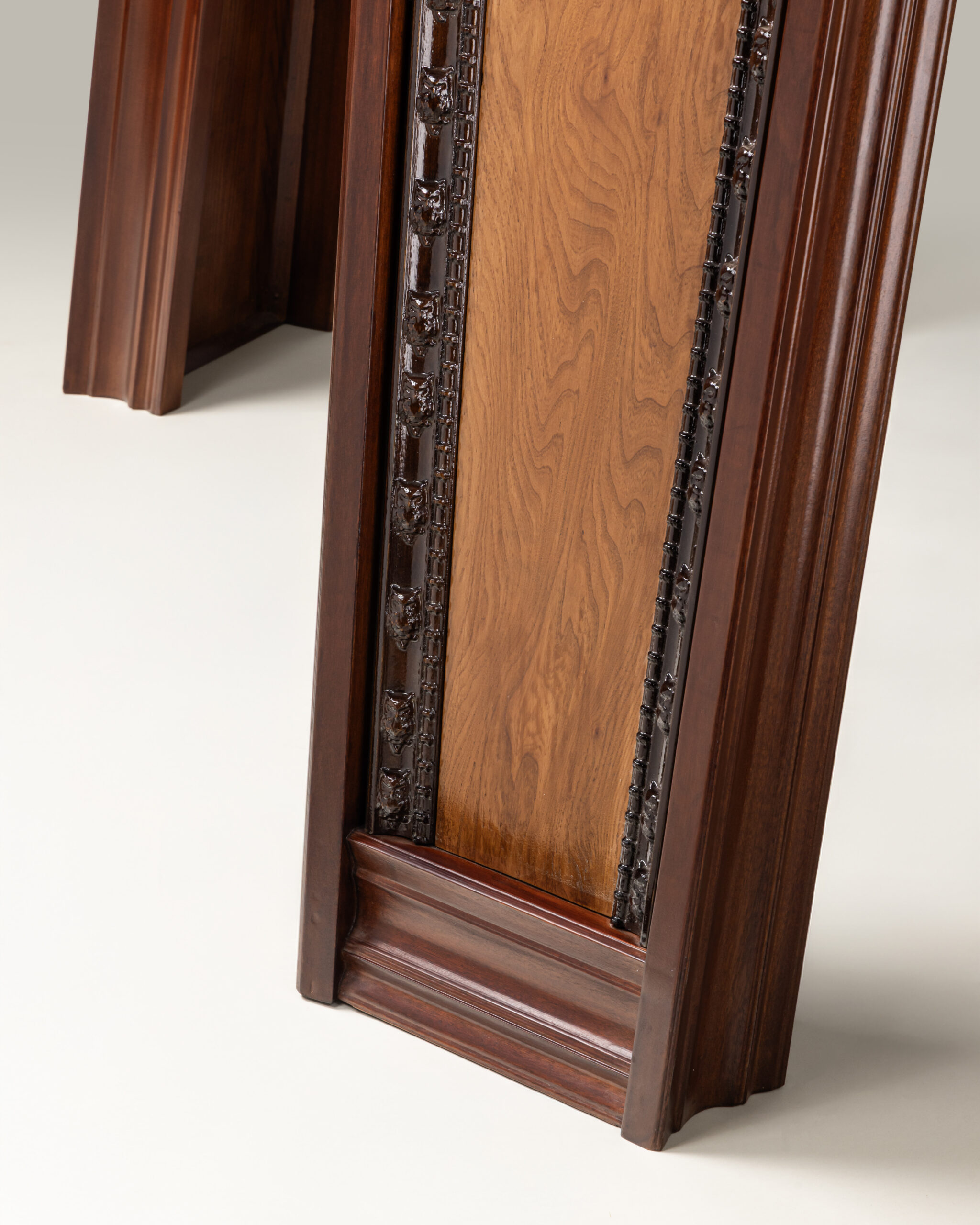 Crafted in solid wood and polished to a deep, lustrous finish, the Parliament Bar Table offers a tactile richness that invites touch and admiration. The top surface is shaped with subtle bevels, lending an elegant silhouette that gently guides the eye across its length without interrupting its authoritative poise.