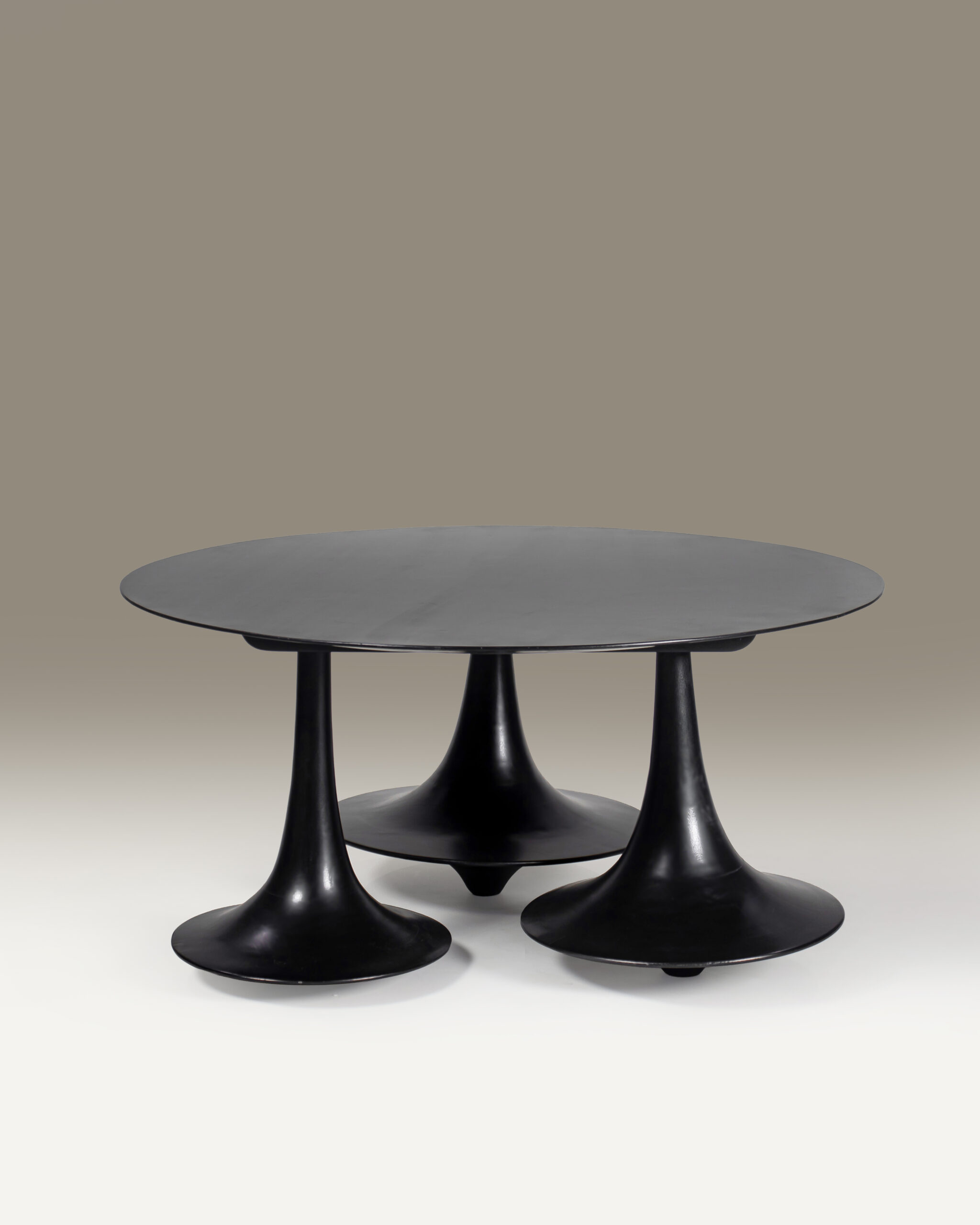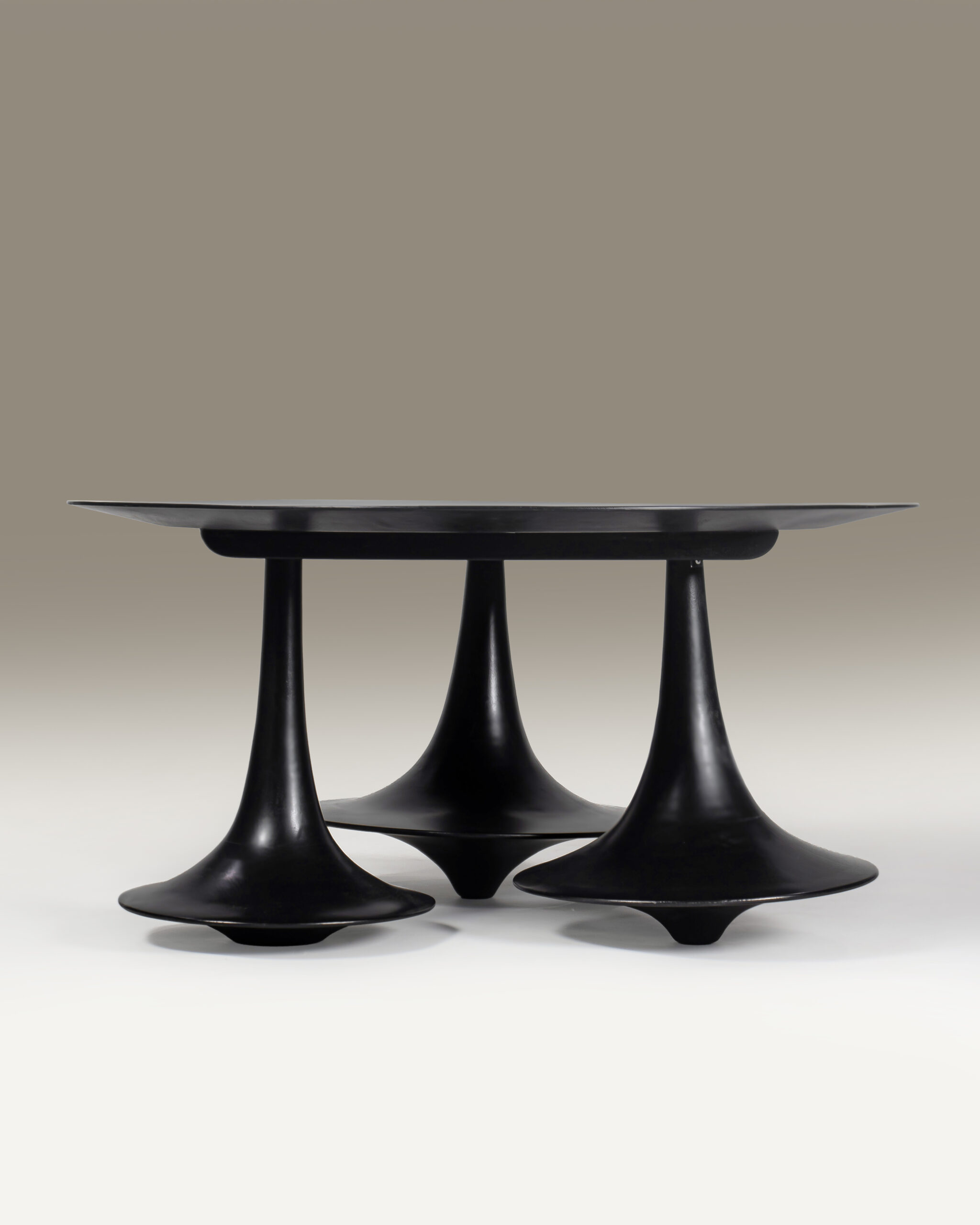 The table rests on three sculptural legs, each shaped as if caught mid-splash — inspired by the organic geometry of water droplets converging in motion. These forms are not merely decorative; they serve as both the visual and structural anchors of the piece, achieving balance through asymmetry. Each leg rises from the ground with fluid continuity, tapering into elegant contours that evoke the quiet energy of rain meeting earth.