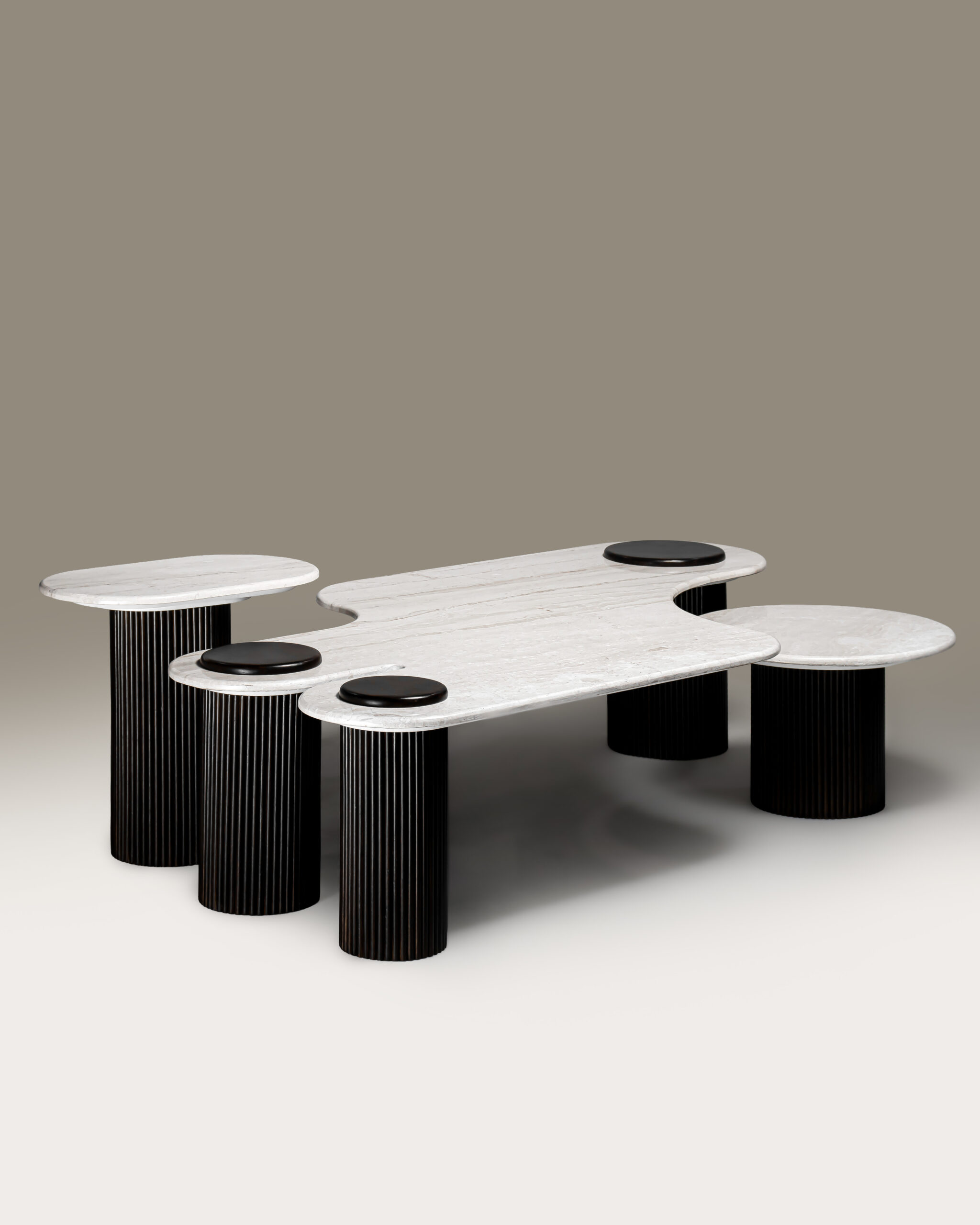 Together, they create a table that feels effortless, almost weightless, despite its substantial presence. The asymmetry is purposeful, lending the piece a natural rhythm — like elements shaped slowly by wind, time, and hand craftsmanship.