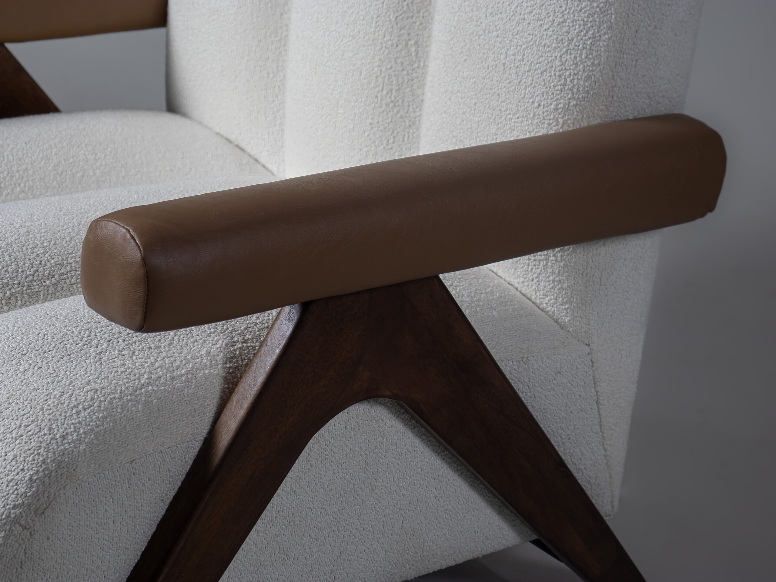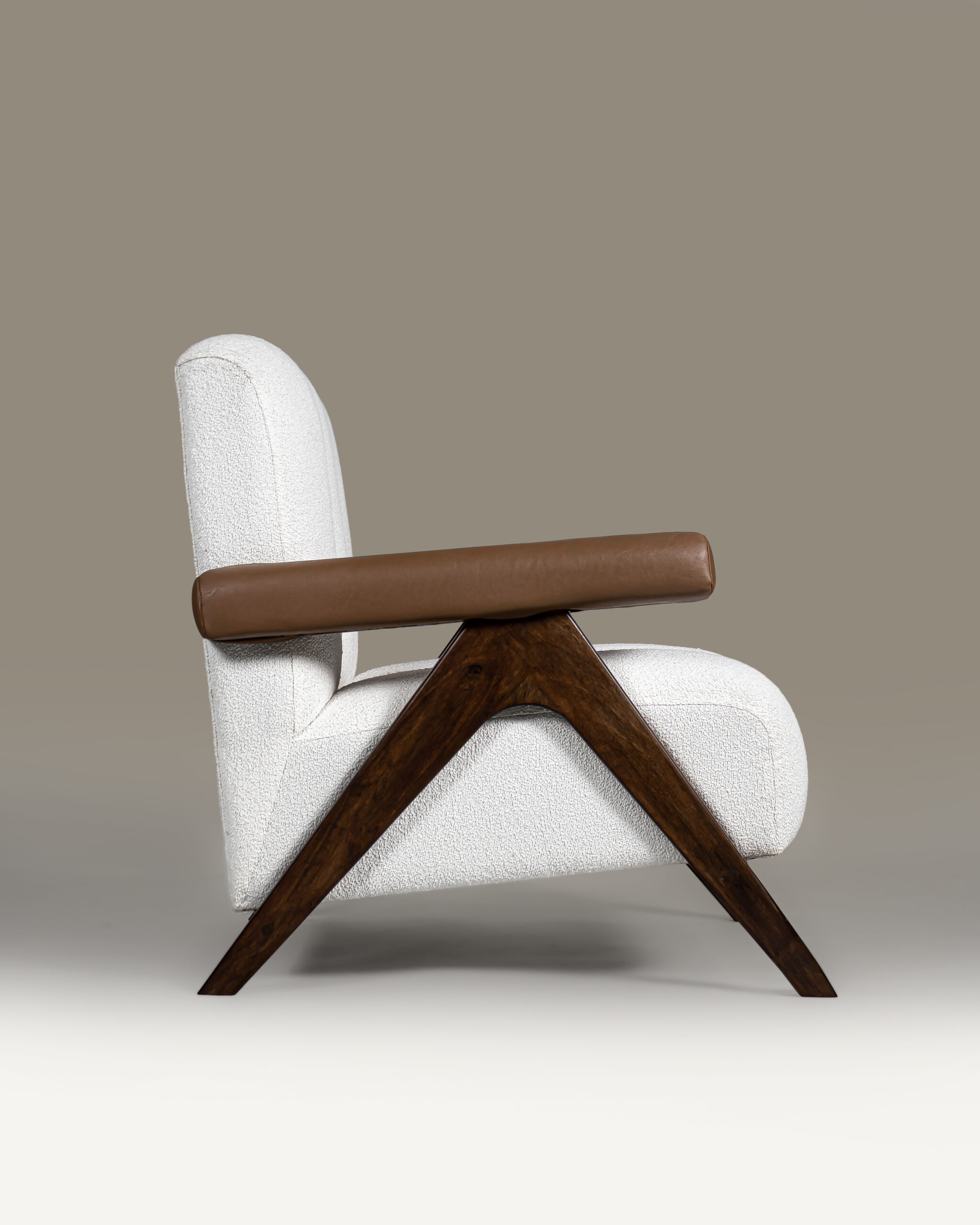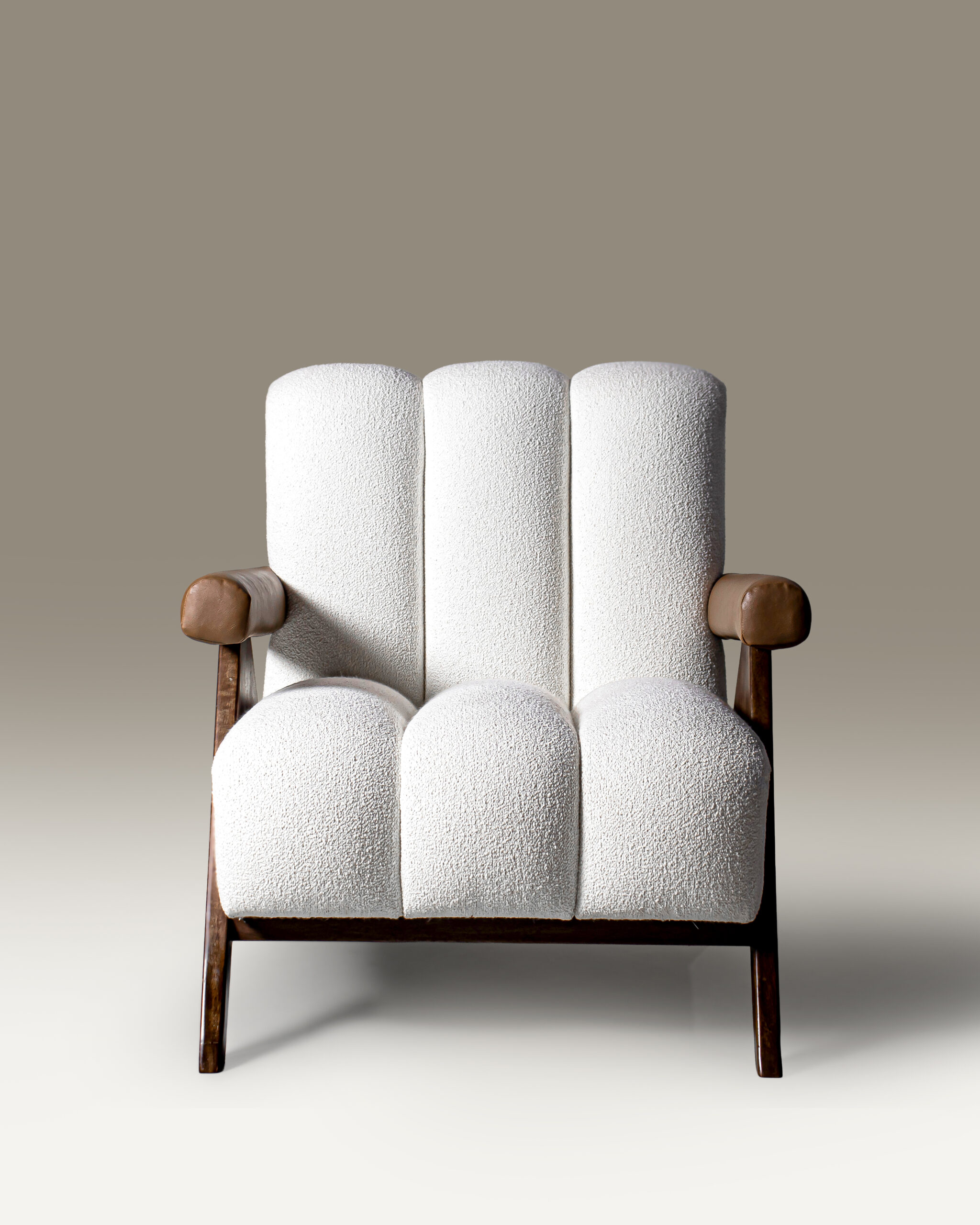 Its distinctive wooden frame anchors the chair with architectural precision, the angular structure evoking mid-century discipline while maintaining Chirmi’s signature contemporary edge. The rich, natural grain of the wood complements the plush, cloud-like upholstery, creating a dialogue between structure and softness. Every angle, curve, and proportion is designed with purpose — to offer comfort that feels deliberate, not accidental.