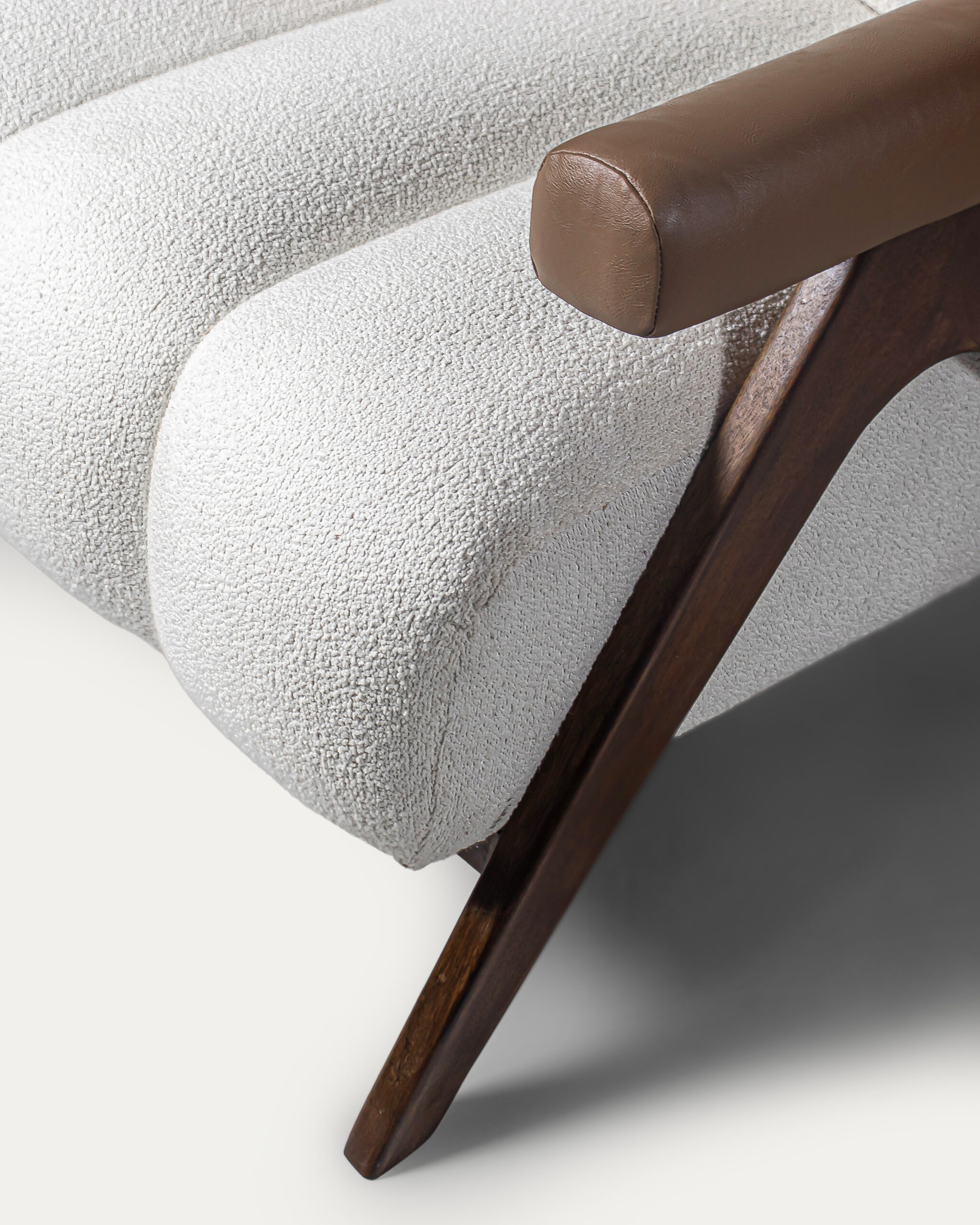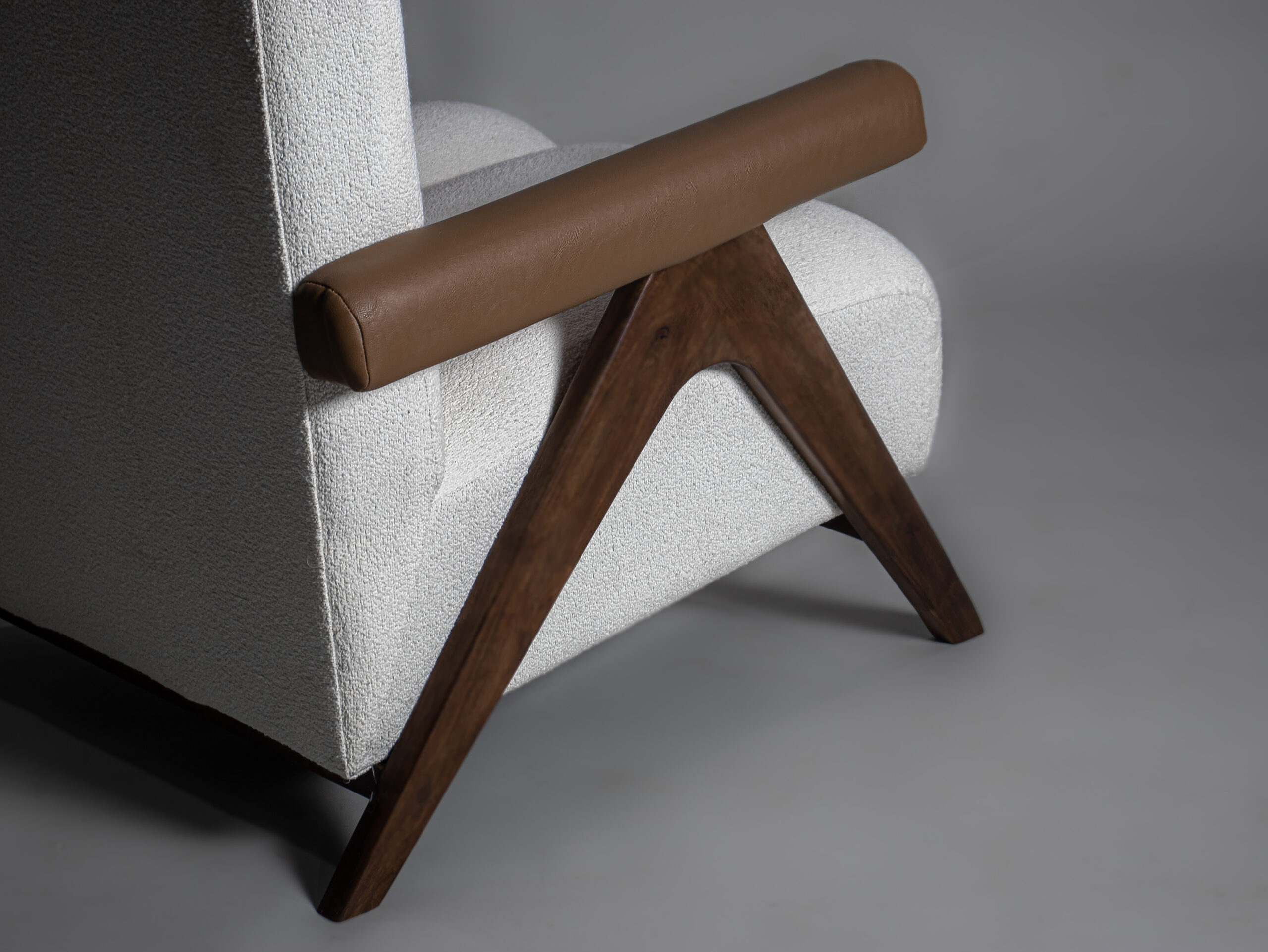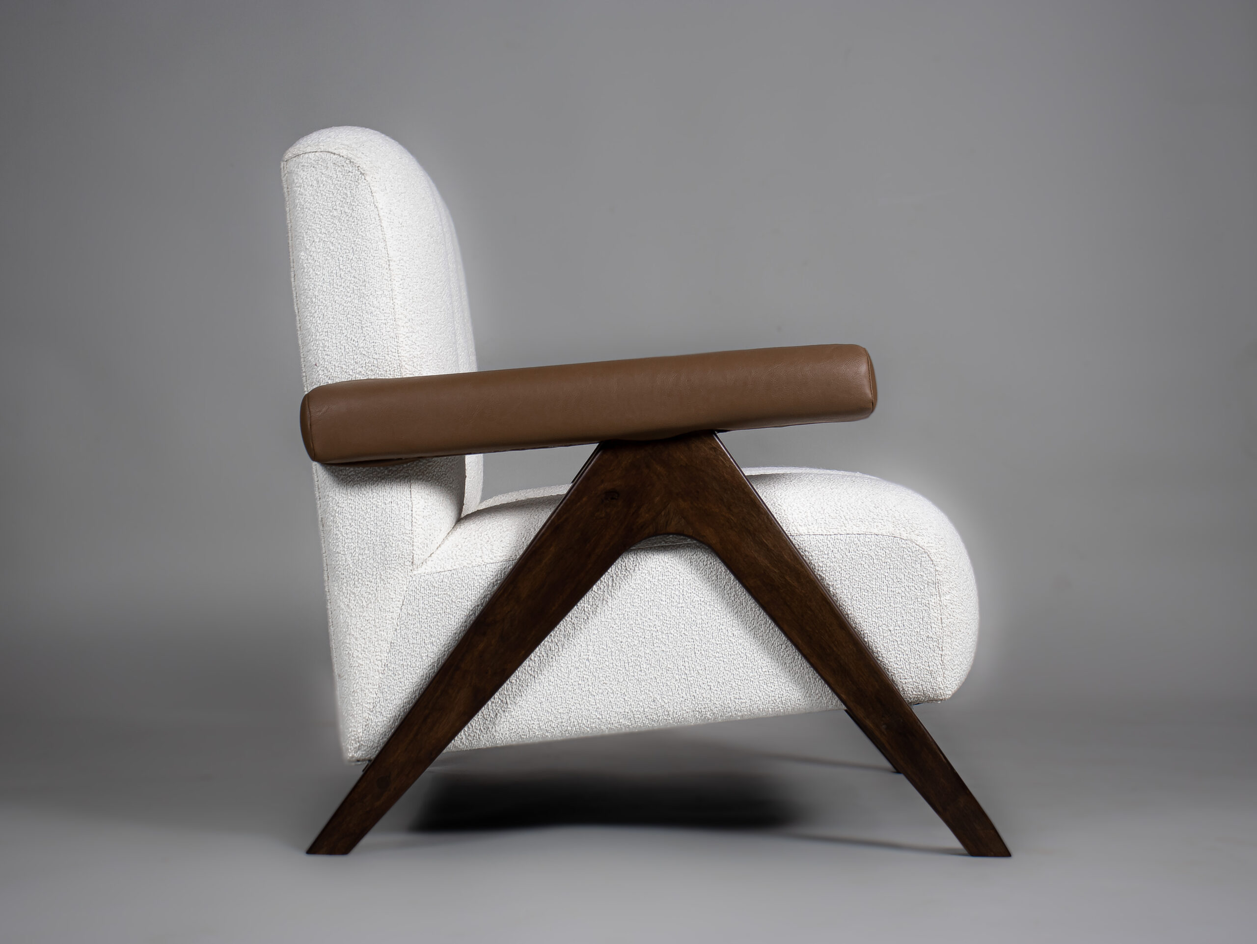 Its distinctive wooden frame anchors the chair with architectural precision, the angular structure evoking mid-century discipline while maintaining Chirmi’s signature contemporary edge. The rich, natural grain of the wood complements the plush, cloud-like upholstery, creating a dialogue between structure and softness. Every angle, curve, and proportion is designed with purpose — to offer comfort that feels deliberate, not accidental.