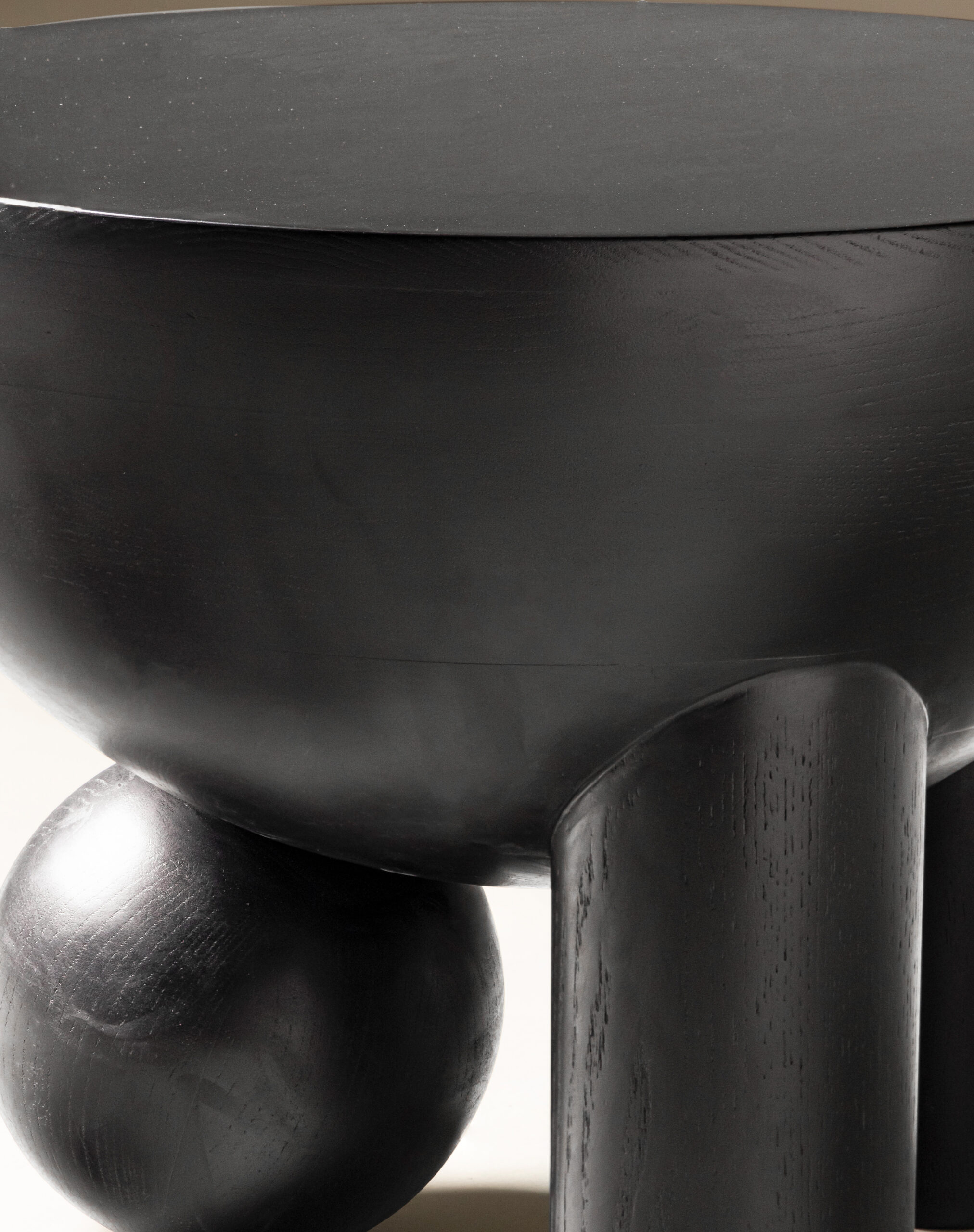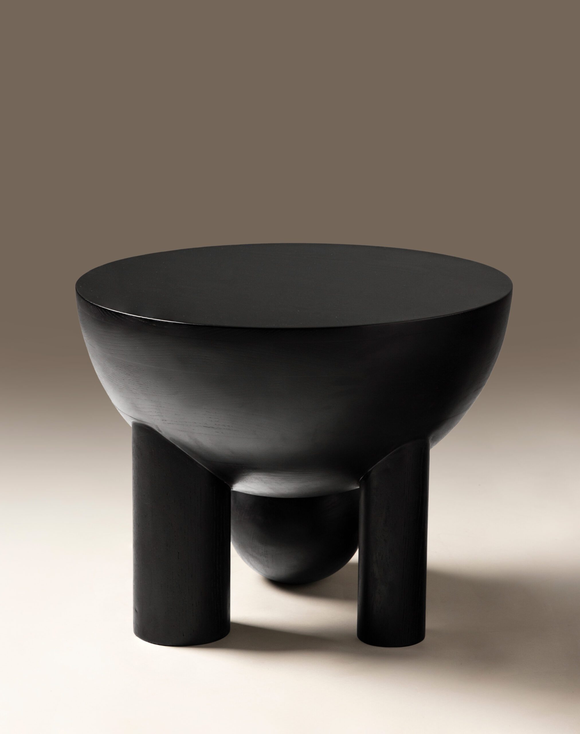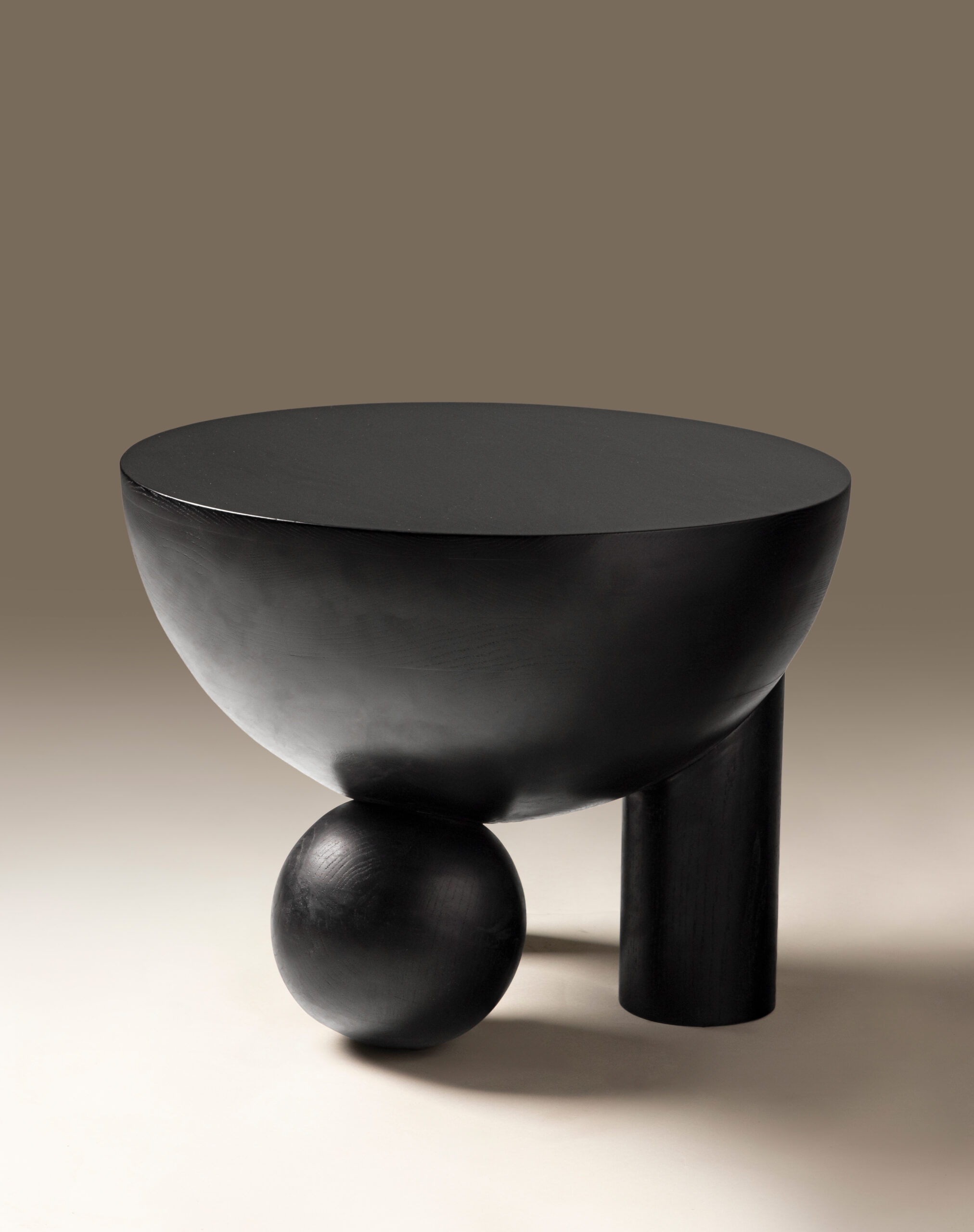 Its matte black finish enhances the sculptural depth, absorbing light to reveal subtle shadows that shift with the day. The rounded bowl top exudes quiet confidence, supported by a dialogue of opposing geometries — circular and linear, floating and grounded. This juxtaposition transforms the table into an object of contemplation, echoing the philosophy of stoicism: strength through stillness.