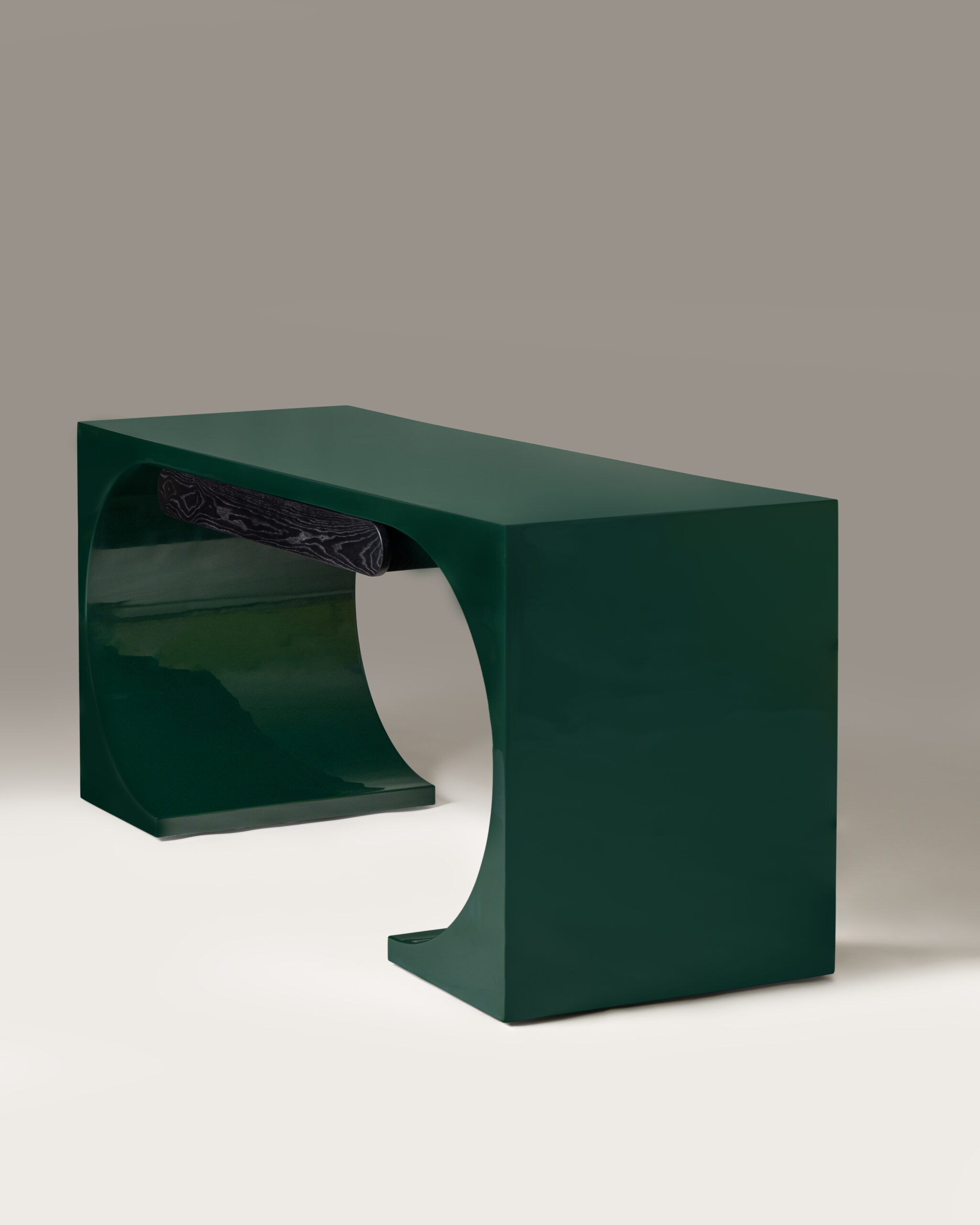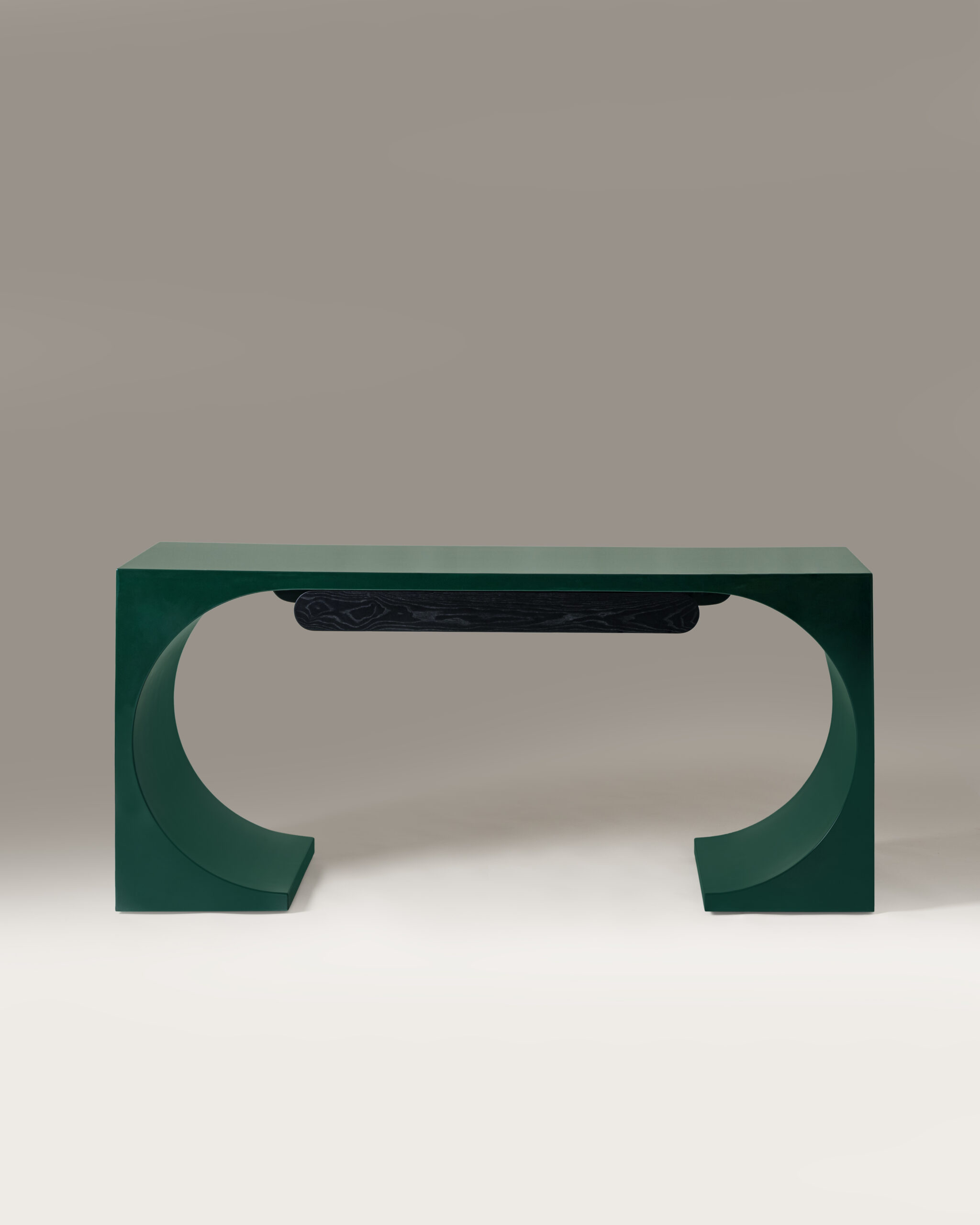 The Verve Console by Home of Chirmi embodies the philosophy of motion within stillness — where fluid arcs meet architectural precision. Its bold, sweeping curves express both dynamism and restraint, creating a visual rhythm that feels alive yet composed. Crafted in a deep, lustrous green finish, the piece radiates modern poise and quiet confidence, evoking the strength of movement captured in a single, elegant gesture.