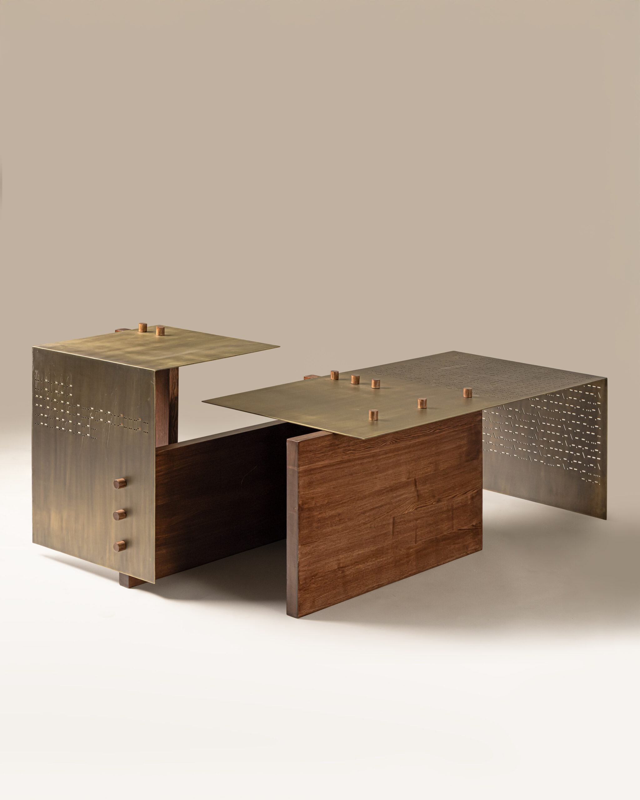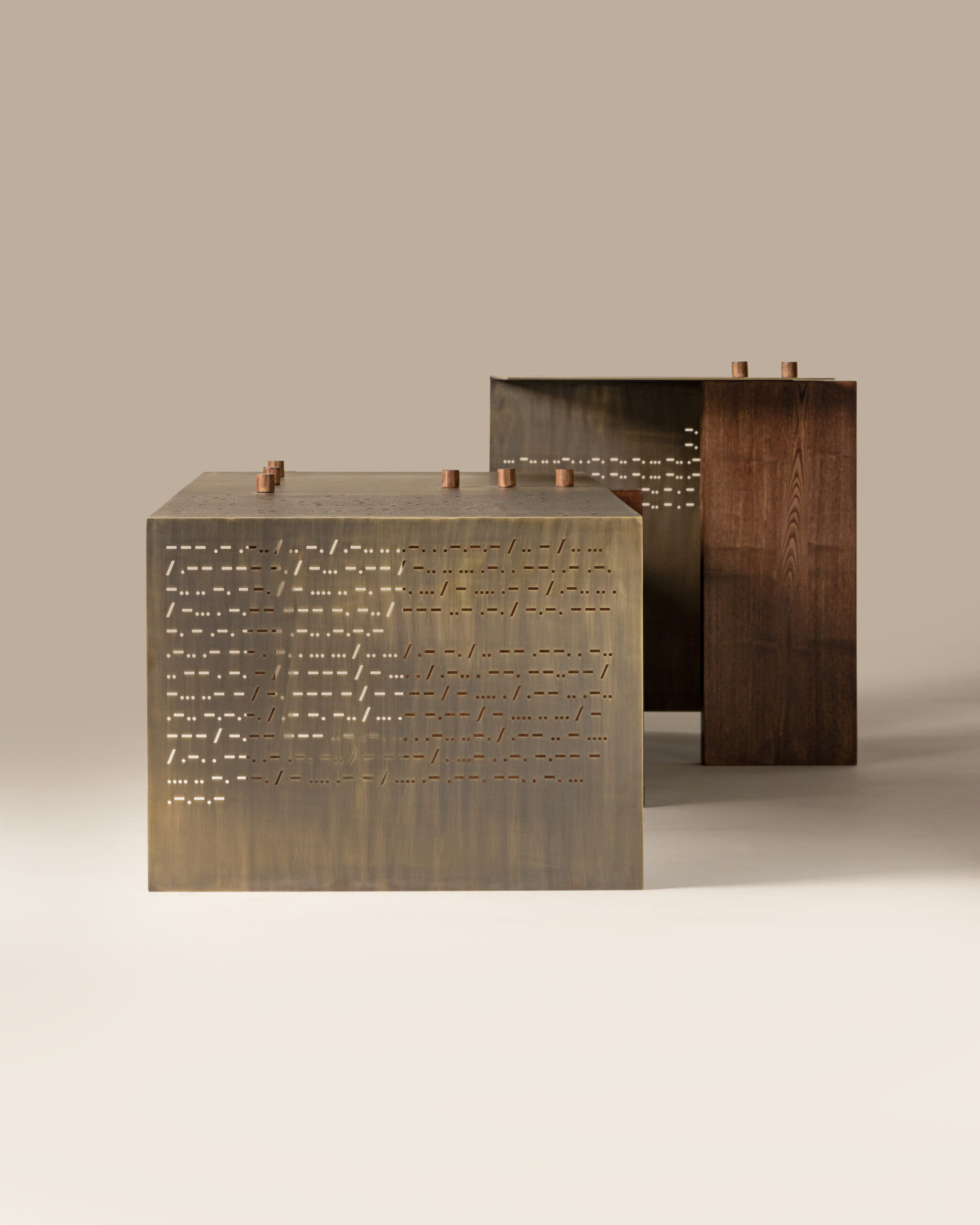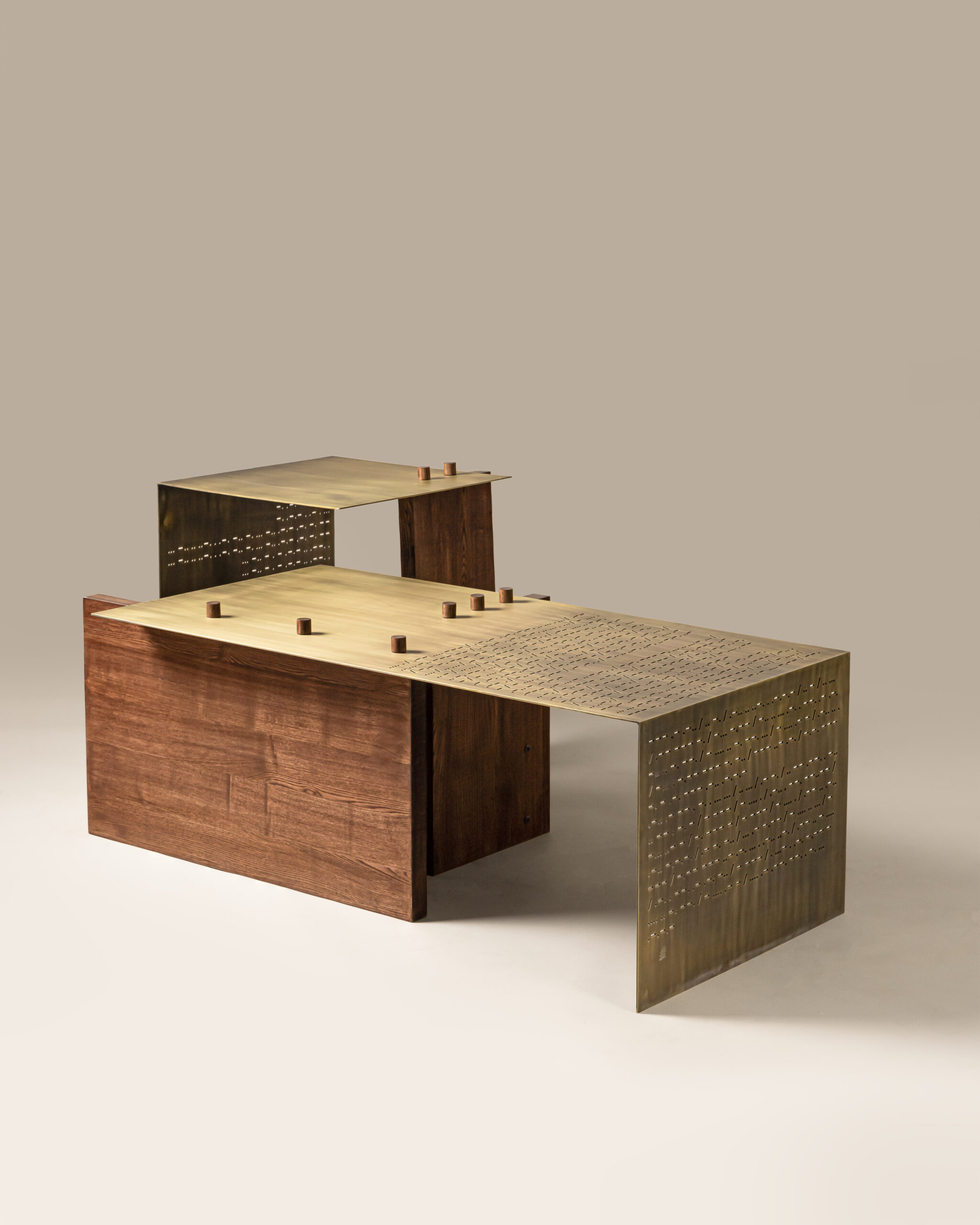 Constructed from premium hardwoods and refined metals, the table balances structure with poise, exuding both power and calm. The finish accentuates the natural texture of the material, while the engraved patterns invite touch and reflection. Light moves across the coded inscriptions, creating subtle highlights that bring the written wisdom to life — words made eternal through design.