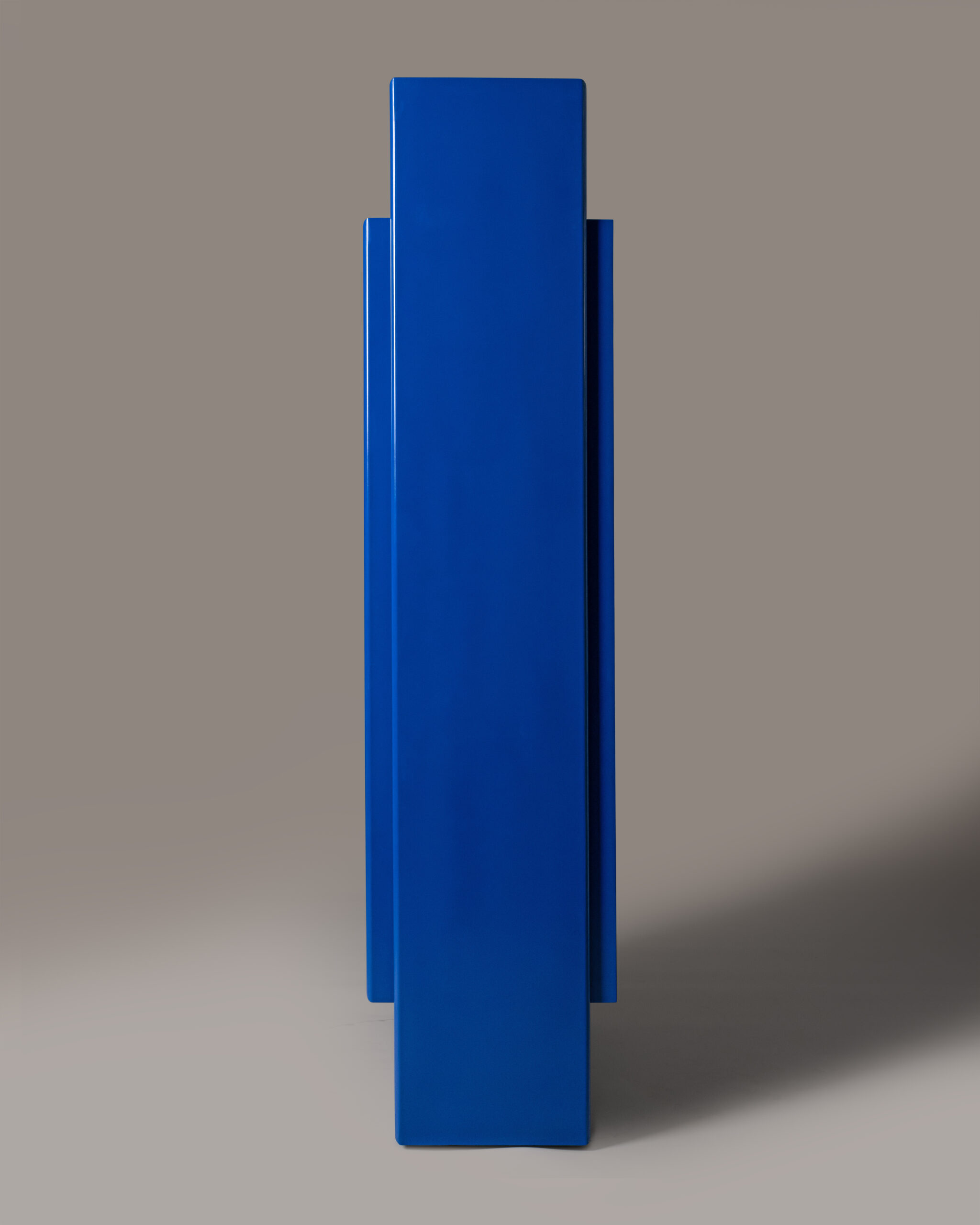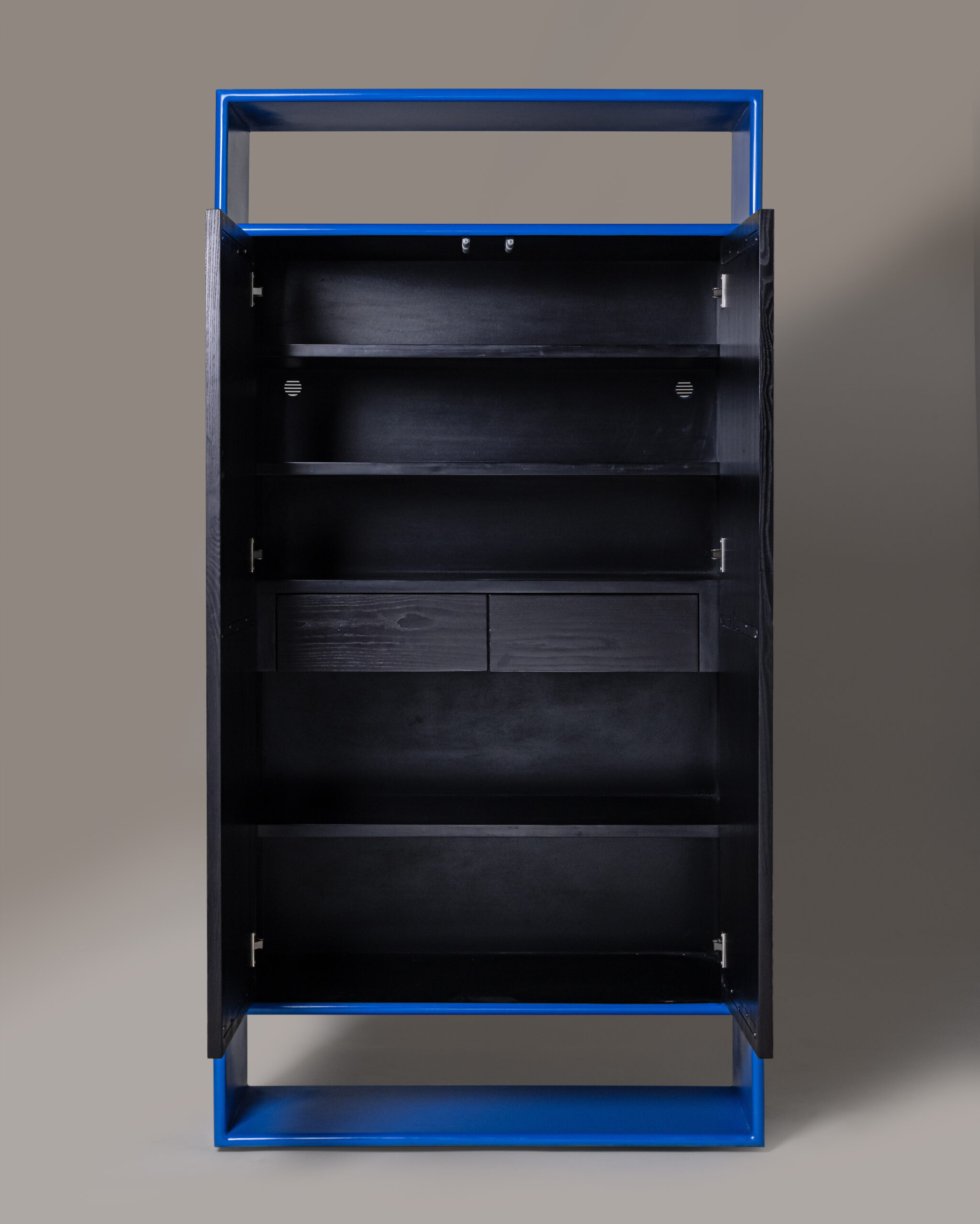 The structure itself reflects Chirmi’s design philosophy — bold yet introspective, grounded yet transcendent. The deep blue hue embodies serenity and depth, while the fine joinery and subtle metallic details add a sense of reverence and precision. Inside, ample storage is hidden behind this sculptural façade, marrying spiritual symbolism with everyday function.