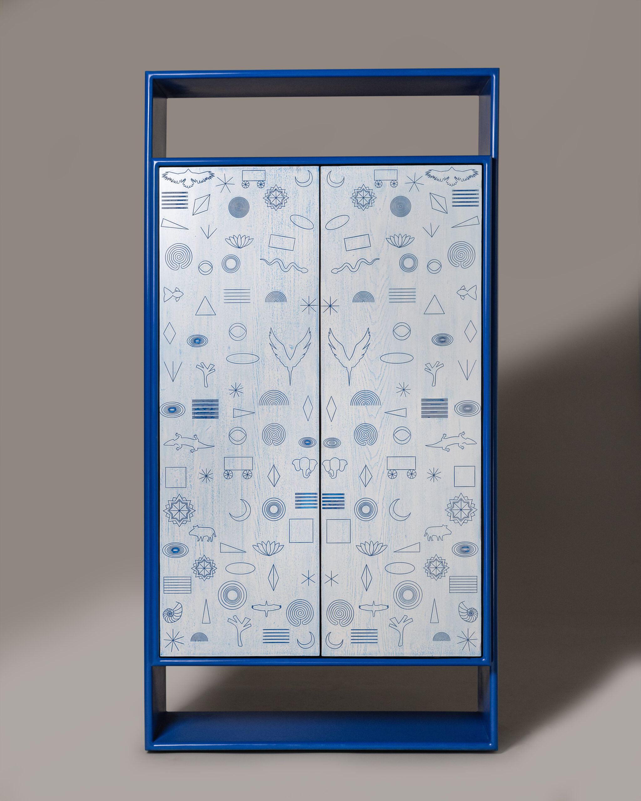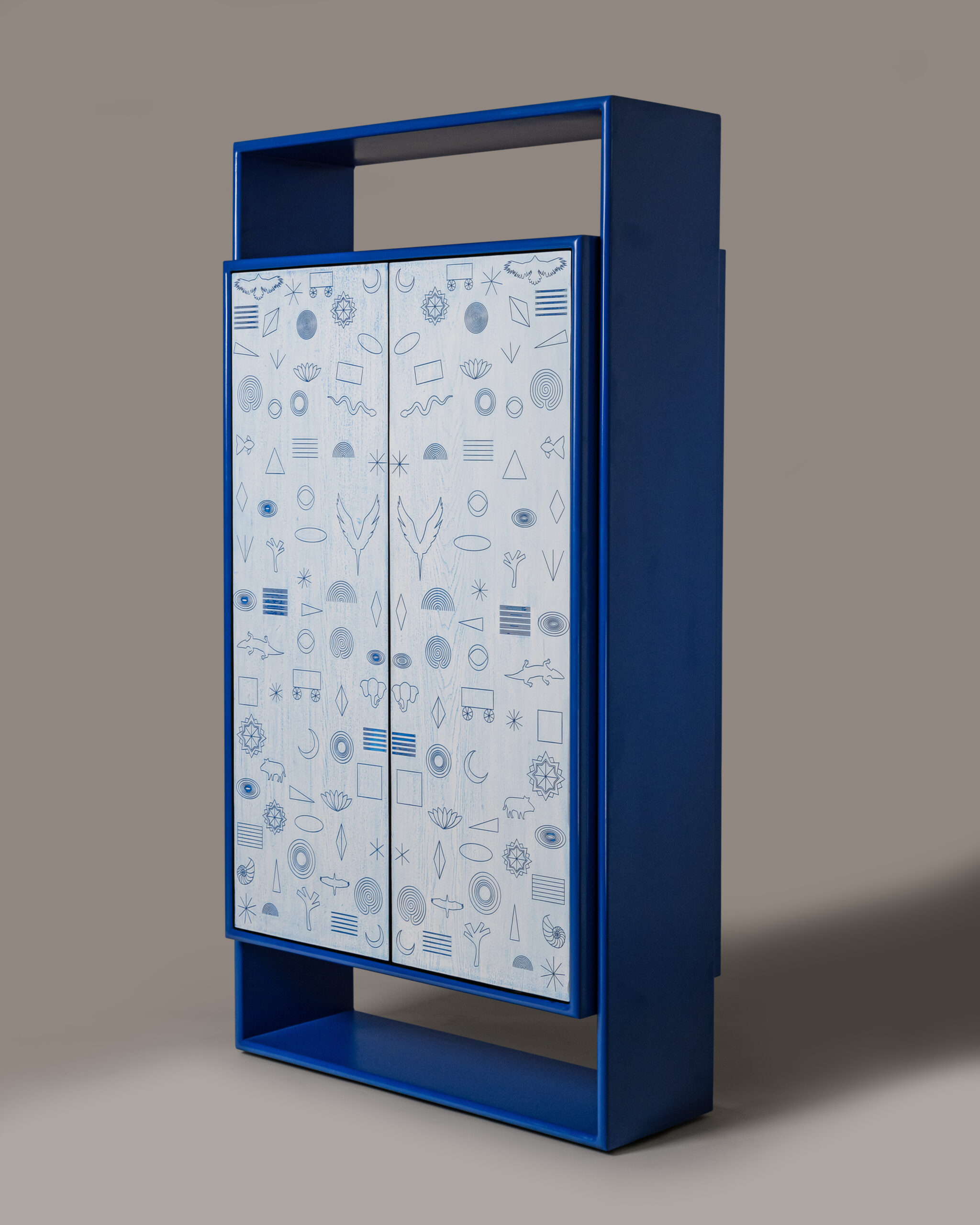 Encased in a striking blue frame, the cabinet’s façade unfolds like a night sky translated into form. Intricate constellations and symbolic motifs are etched with meticulous craftsmanship, each line representing balance, rhythm, and the unseen harmonies that govern all creation. The surface becomes a canvas — not of paint, but of geometry and devotion — where art and architecture converse in quiet dignity.