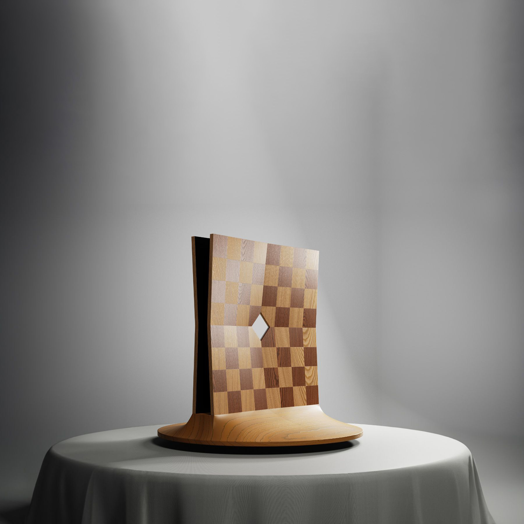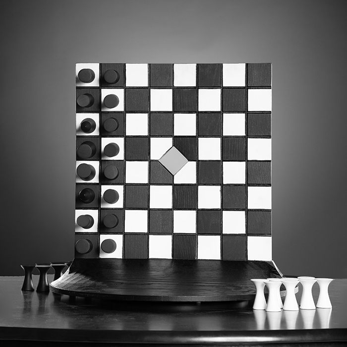 Meticulously handcrafted, the wooden structure embodies Chirmi’s pursuit of perfection — polished, minimal, and futuristic, yet rooted in material honesty. The smooth contours lead the eye upward, creating an illusion of perpetual ascent, while the dark finish contrasts dramatically against the luminous white chess pieces, emphasizing every tactical shift in play.