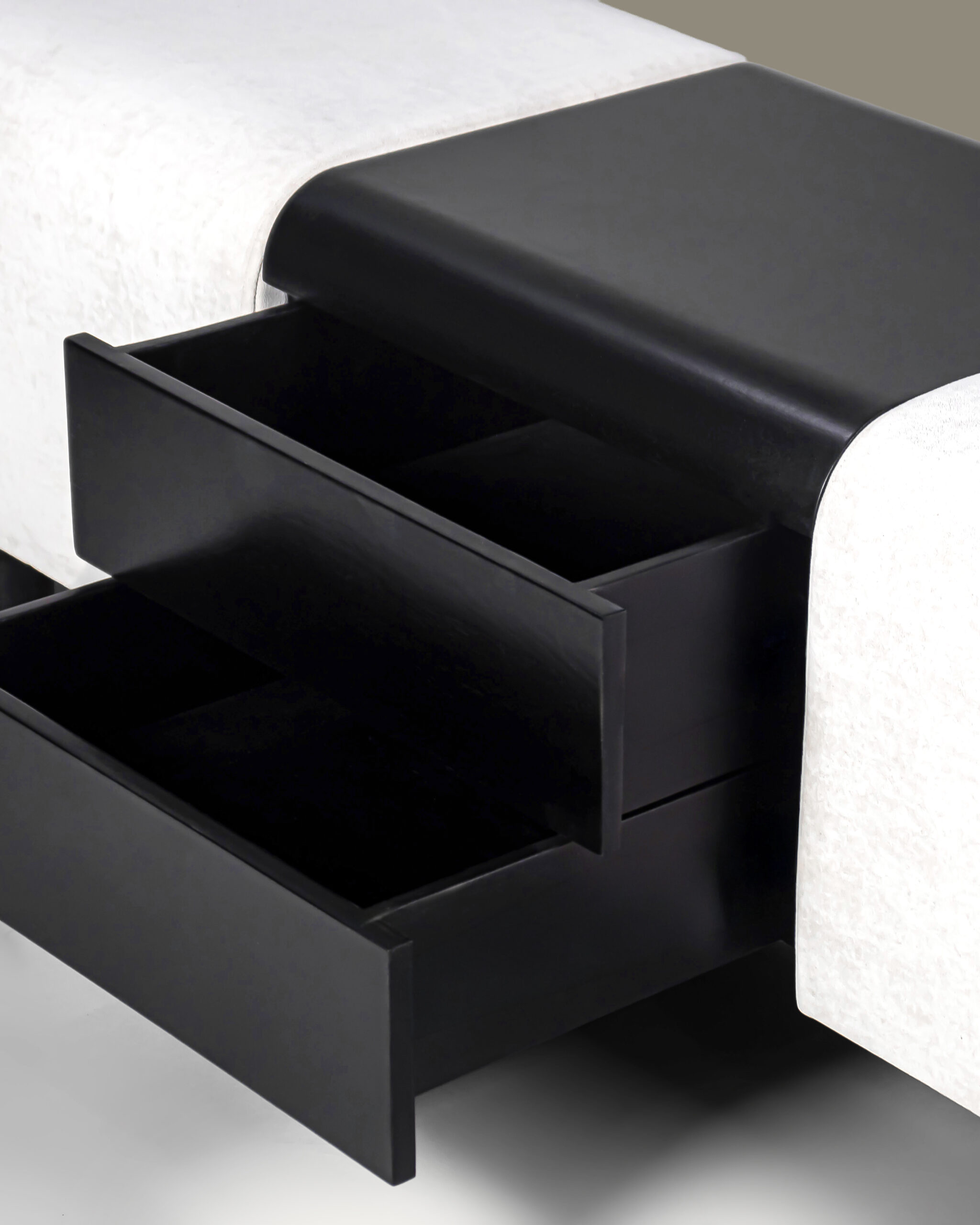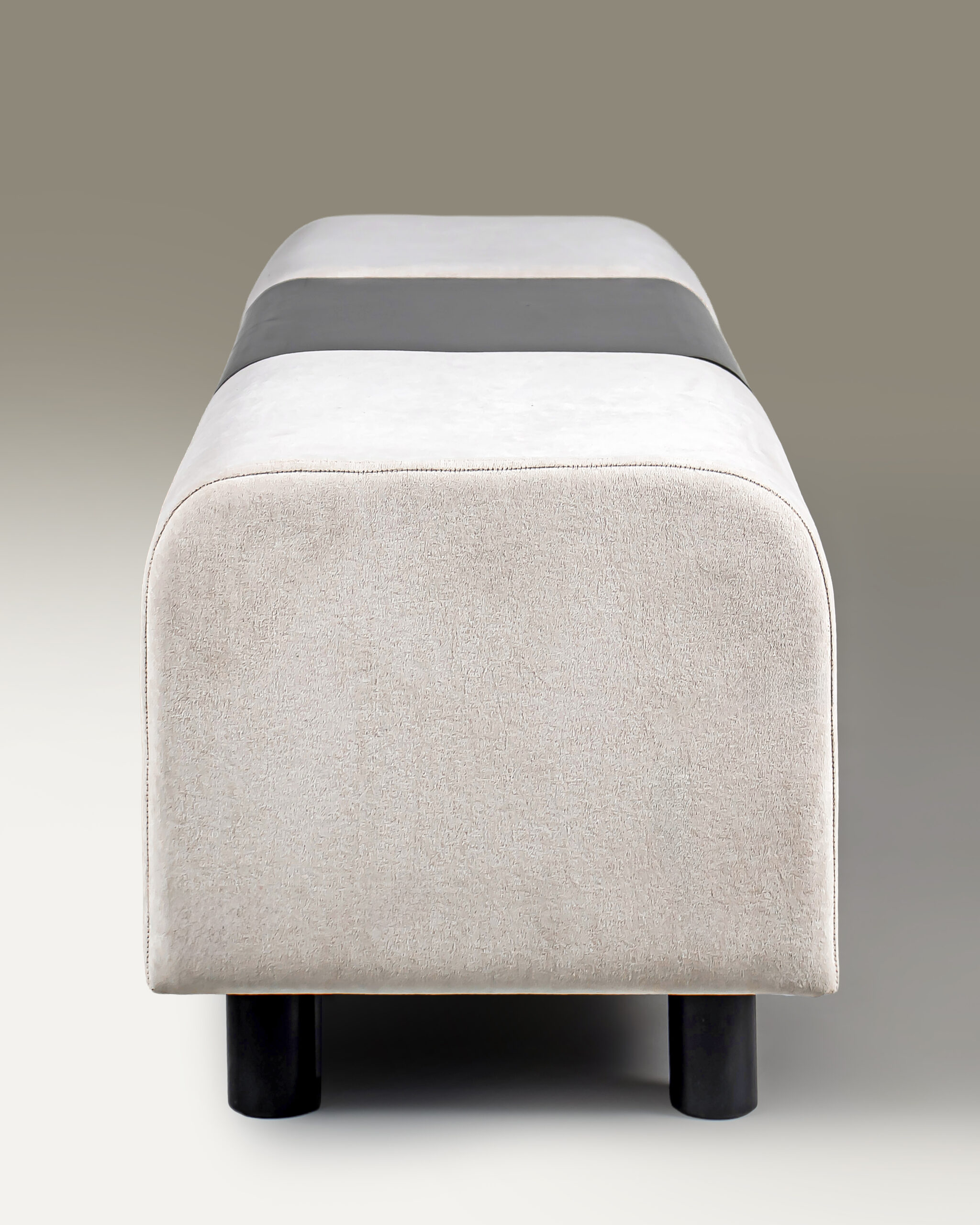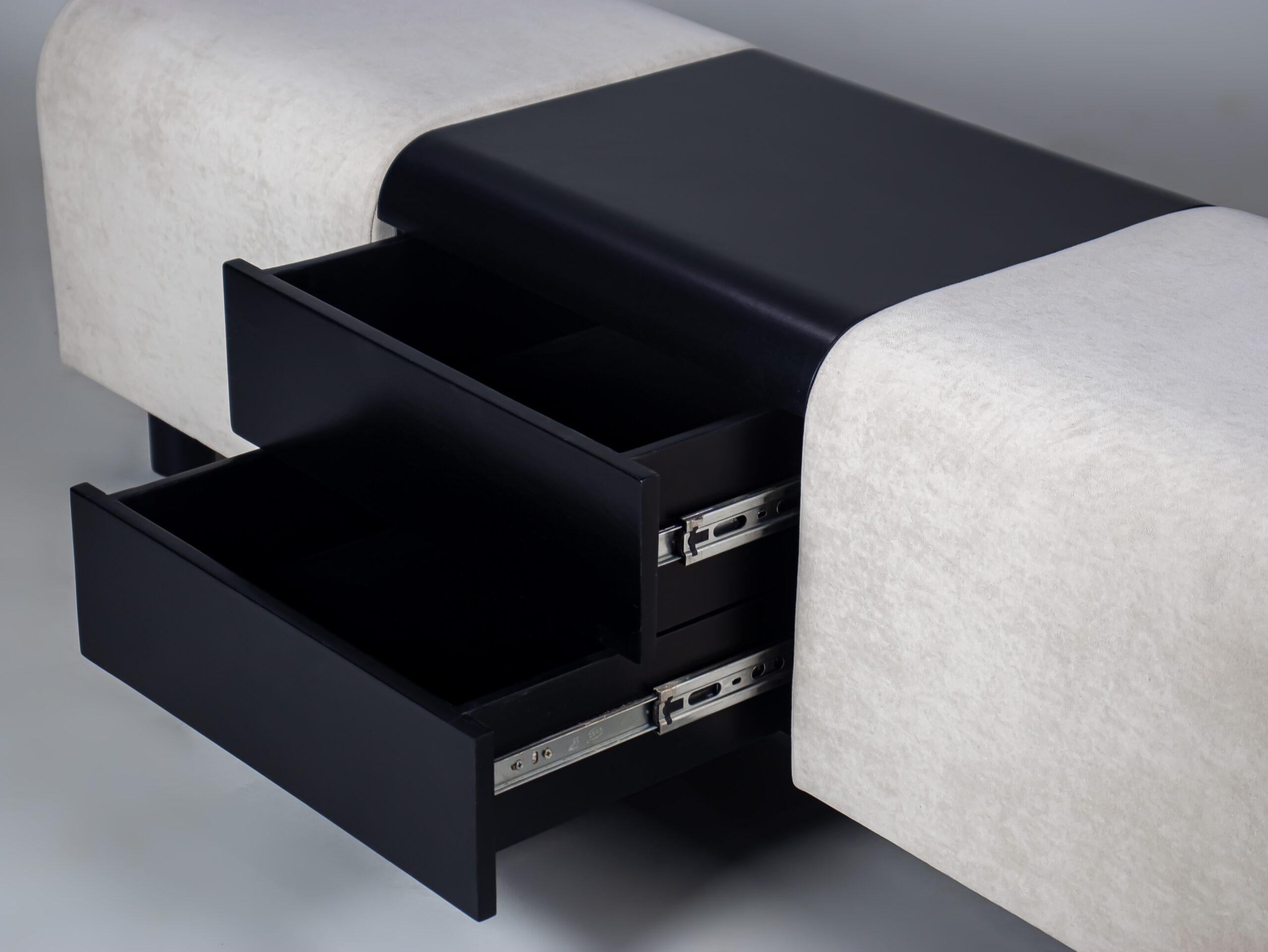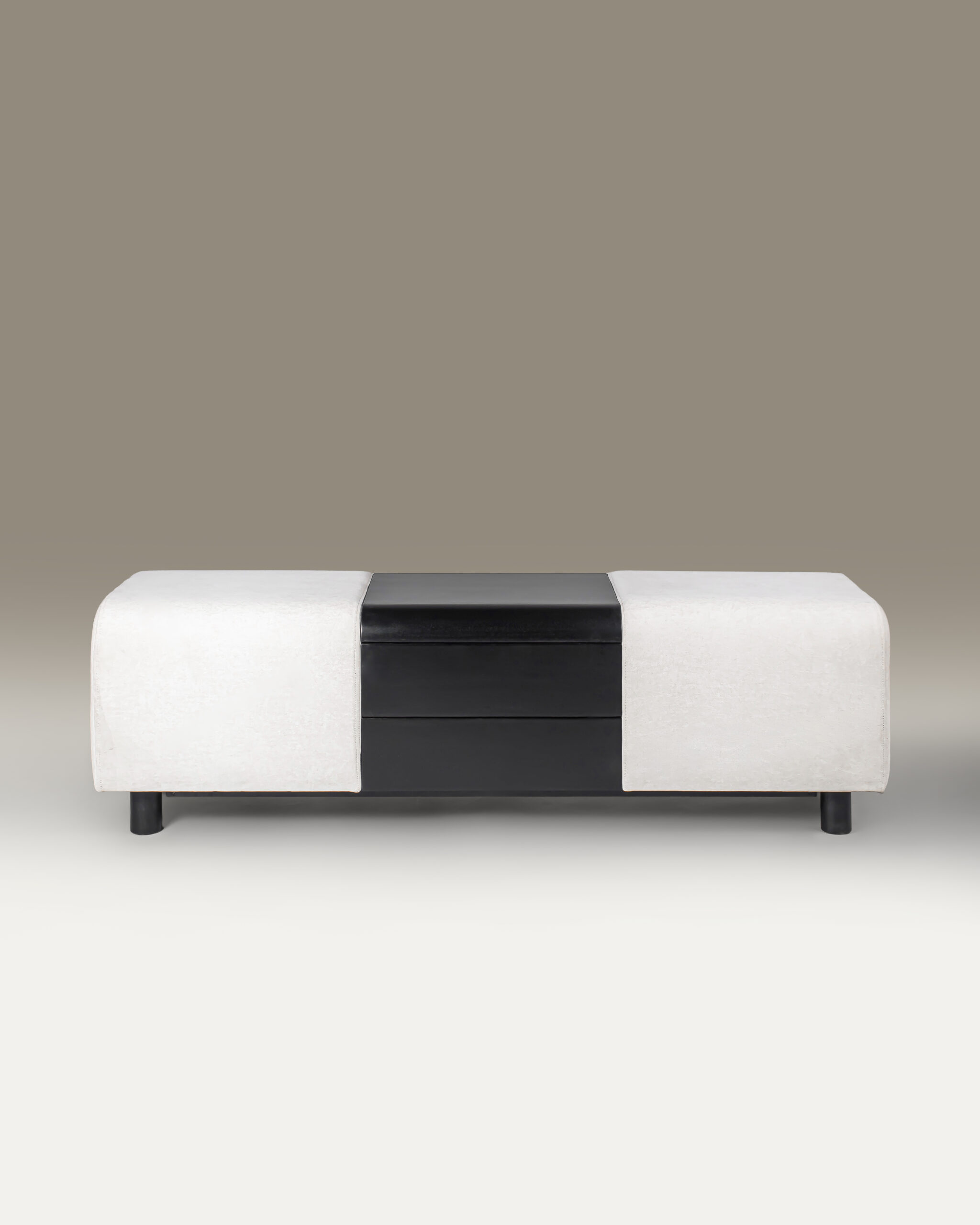 Built to comfortably seat two, the ottoman’s proportions are balanced to feel both generous and contained, making it an adaptable piece for contemporary homes. Its two spacious drawers glide quietly beneath the seat, offering discreet storage for essentials — from throws and linens to books or accessories — maintaining visual order without compromising on style. The sturdy wooden frame, combined with refined upholstery, gives the Zephyr Ottoman a grounded yet graceful presence. Every element — from the hand-finished edges to the subtle textures of fabric and surface — is crafted with precision to achieve durability and visual harmony.
